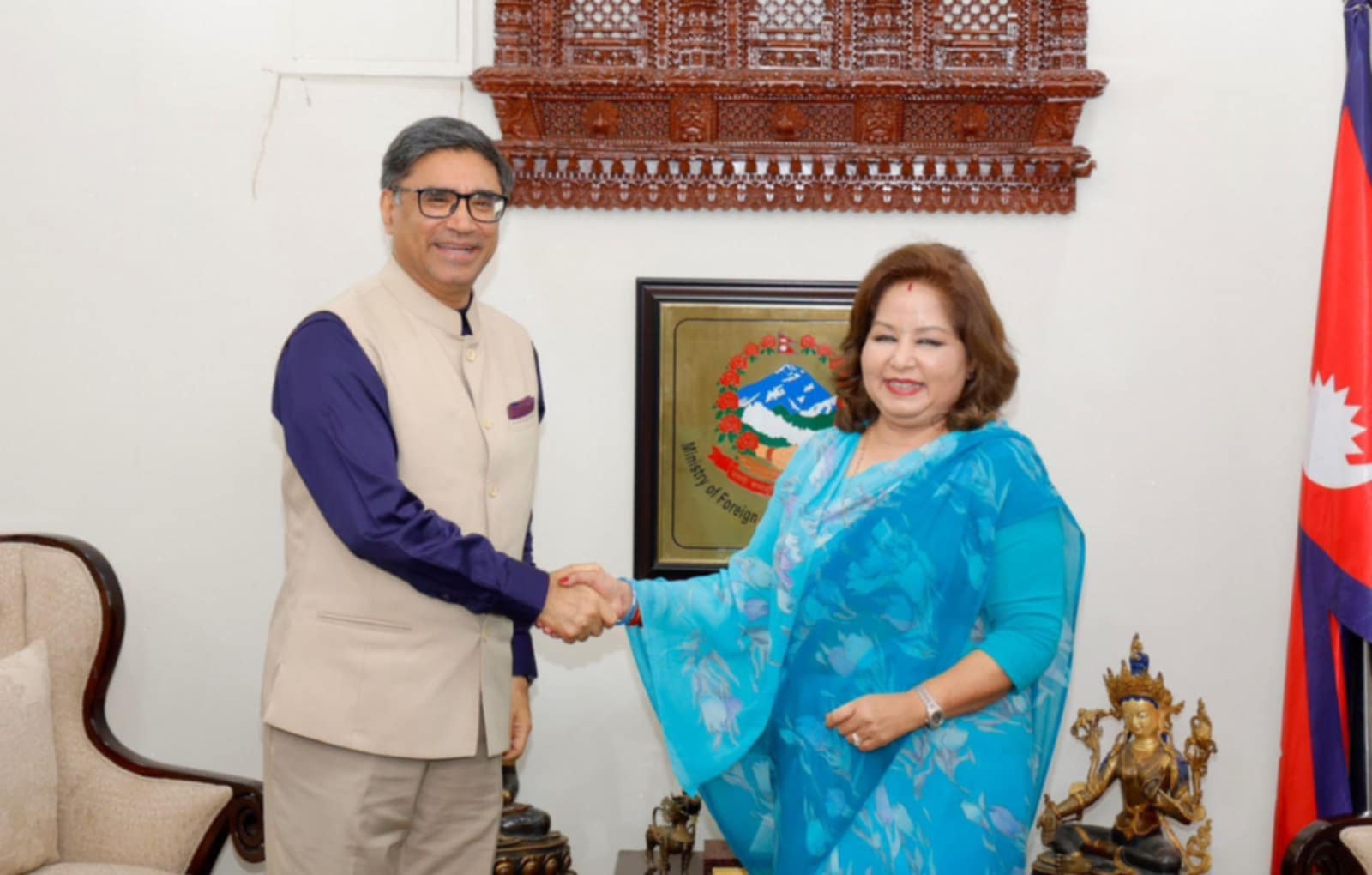 काठमाडौं । परराष्ट्रमन्त्री डा. आरजु राणा देउवासँग भारतीय विदेशसचिव विक्रम मिस्रीले आज मन्त्रालयमा शिष्टाचार भेटवार्ता गरेकी छन् । त्यस वार्ताका क्रममा नेपाल भारत सम्बन्धका विविध आयामहरुको चर्चा गर्दै आपसी हित, पारस्परिक सम्बन्ध र साझा चासोका विषयहरुमा कुराकानी भएको थियो ।