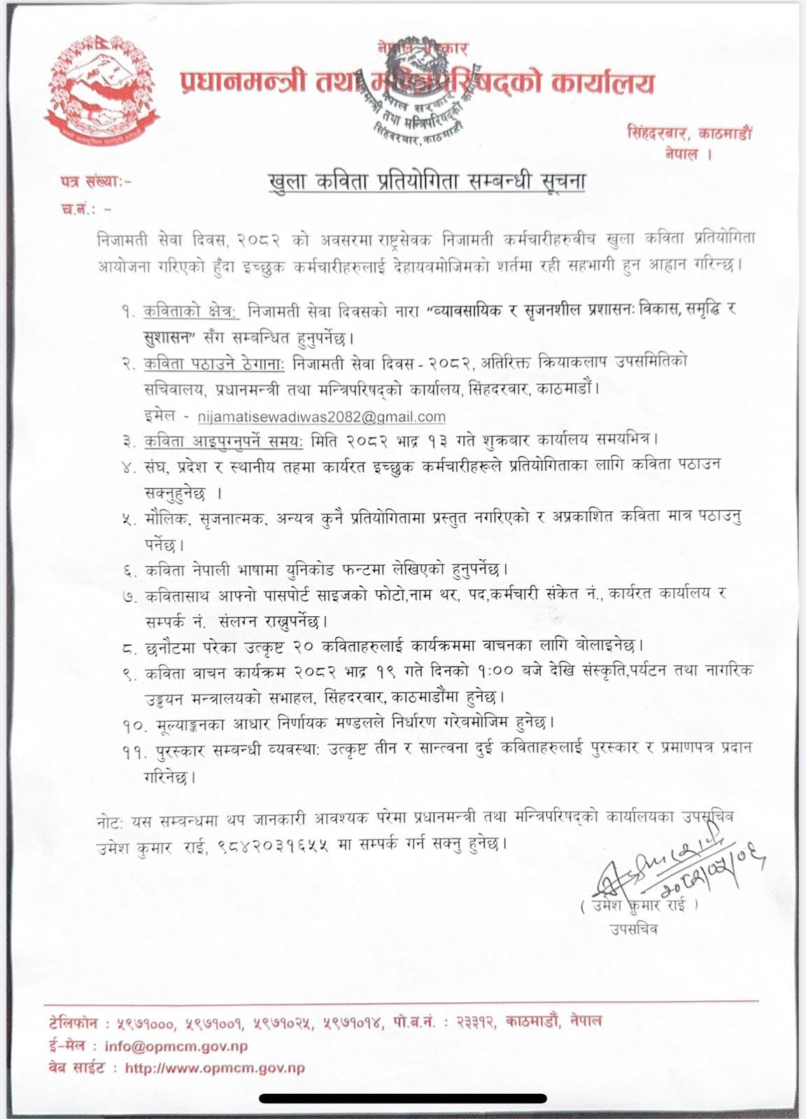 काठमाडौँ । निजामती सेवा दिवस २०८२ का अवसरमा राष्ट्रसेवक निजामती कर्मचारीहरुका बीचमा खुला कविता प्रतियोगिता हुने भएको छ ।