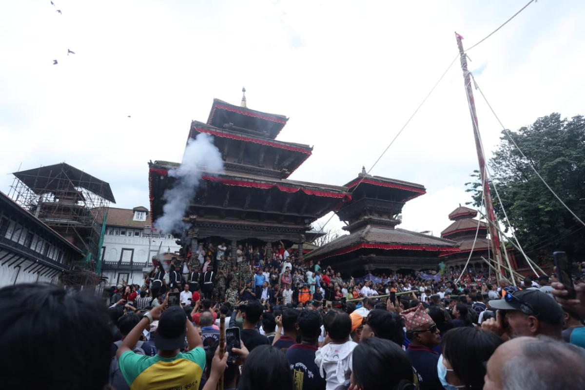 काठमाडौँ। विश्व सम्पदा सूचीमा सूचीकृत हनुमानढोका दरबार क्षेत्रस्थित कालभैरवको मूर्तिअघि ईन्द्रजात्राको लिङ्गो उठाइएको अर्थात् इन्द्रध्वजोत्थान गरिएको छ । नेपाल पञ्चाङ्ग निर्णायक विकास समितिले दिएको साइत अनुसार आज बिहान १०ः३१ बजे कालभैरवको मूर्तिअघि इन्द्रध्वजोत्थान गरिएको गुठी संस्थान काठमाडौँ शाखा कार्यालयका प्रमुख लक्षुणा शर्माले जानकारी दिए । यसअघि भदौ १५ गते ईन्द्रजात्राको लिङ्गो नगर प्रवेश गराइएको थियो ।