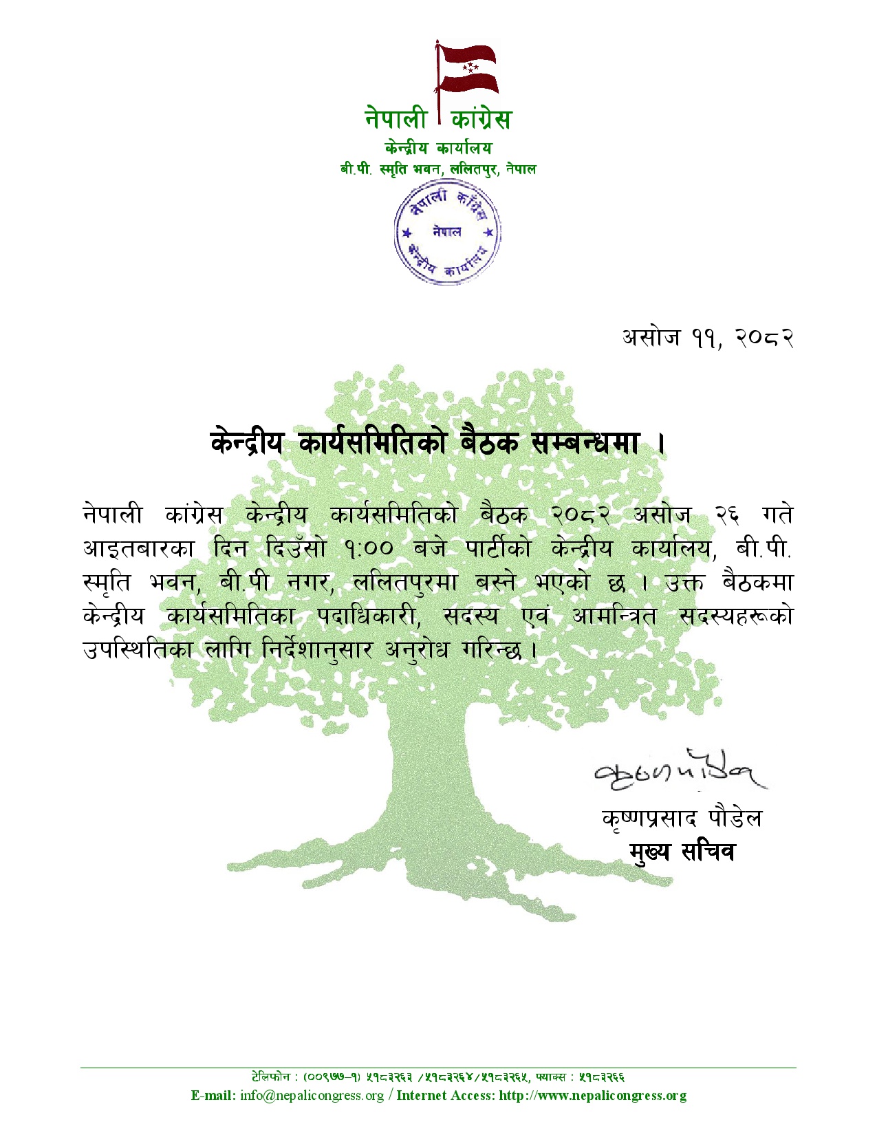 पार्टी केन्द्रीय कार्यालयका मुख्यसचिव कृष्णप्रसाद पौडेलले सभापति शेरबहादुर देउवाले असोज २६ गते आइतबार दिउँसो १ बजे केन्द्रीय कार्यालय सानेपामा बस्ने गरी बैठक बैठक बोलाउनुभएको जानकारी दिए ।