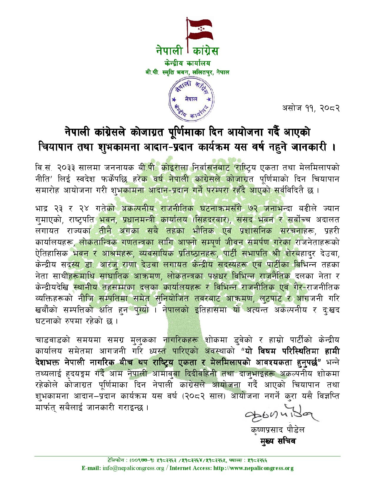काठमाडौँ। नेपाली काँग्रेसले हरेक वर्ष कोजाग्रत पूर्णिमाको अवसरमा आयोजना गर्दै आएको परम्परागत चियापान तथा शुभकामना आदान-प्रदान कार्यक्रम यस वर्ष नगर्ने भएको छ।