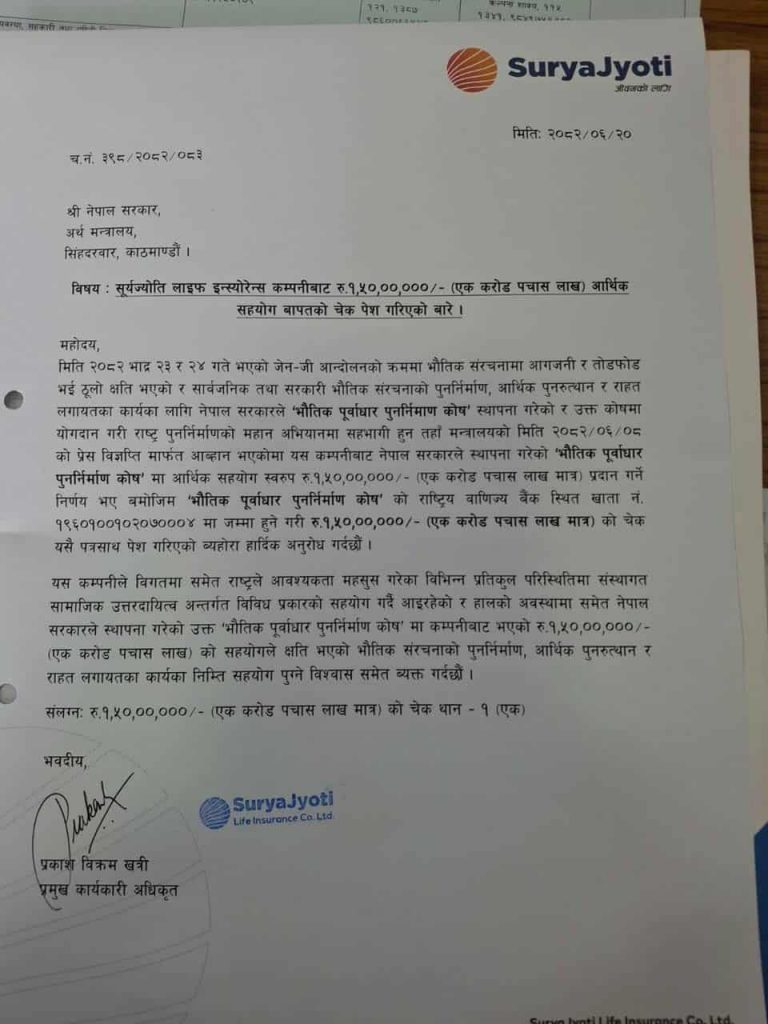 काठमाडौं ।देशमा हालै भएको जेन–जी आन्दोलनका क्रममा भएका तोडफोड तथा आगजनीका घटनाबाट क्षतिग्रस्त भौतिक संरचनाको पुनर्निर्माण, आर्थिक पुनरुत्थान तथा राहत कार्यका लागि नेपाल सरकारले स्थापना गरेको ‘भौतिक पूर्वाधार पुनर्निर्माण कोष’ मा सूर्यज्योति लाइफ इन्स्योरेन्स कम्पनी लिमिटेडले एक करोड पचास लाख आर्थिक सहयोग प्रदान गरेको छ।