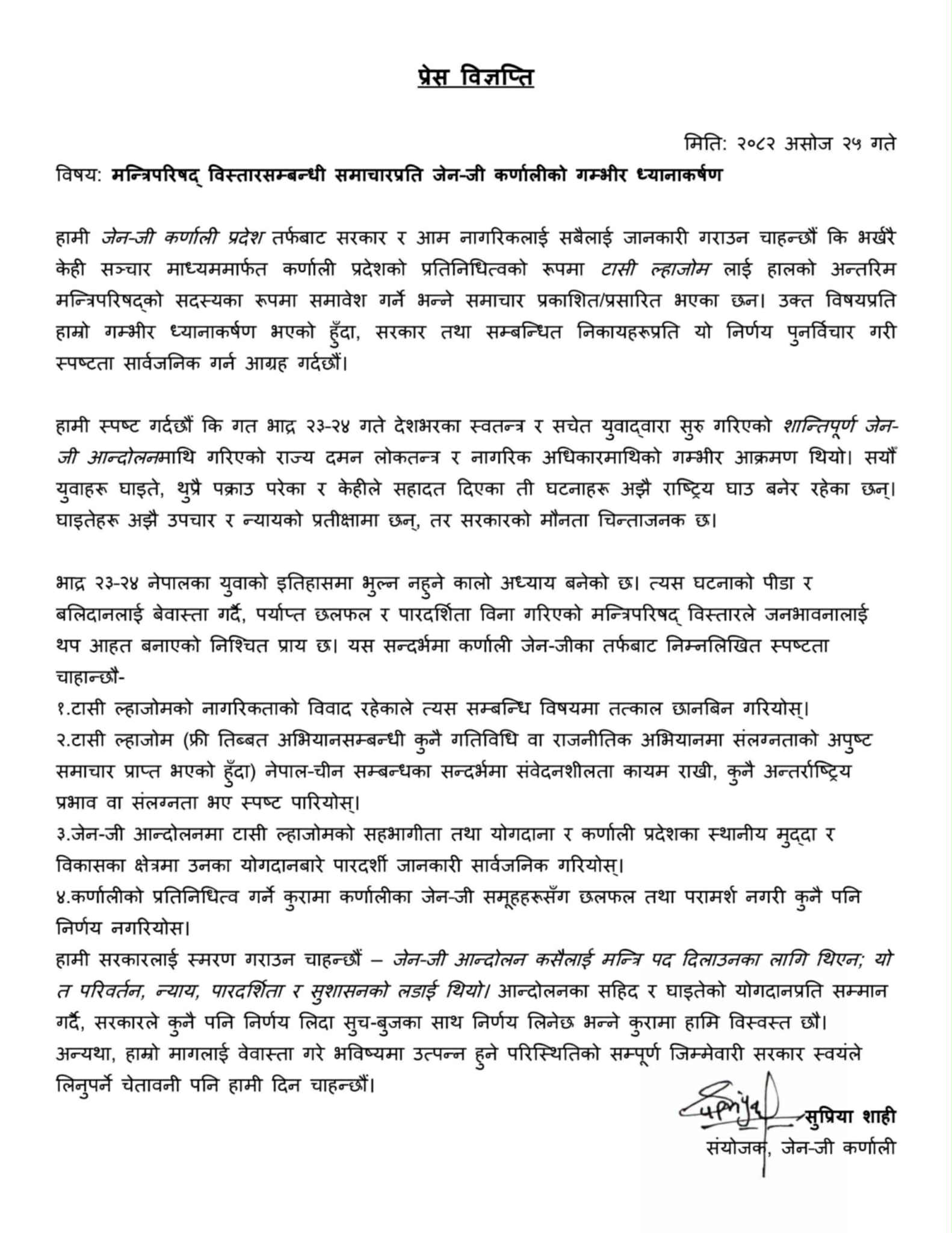 ‘टासी ल्हाजोम (फ्री तिब्बत अभियानसम्बन्धी कुनै गतिविधि वा राजनीतिक अभियानमा संलग्नताको अपुष्ट समाचार प्राप्त भएको हुँदा) नेपाल–चीन सम्बन्धका सन्दर्भमा संवेदनशीलता कायम राखी, कुनै अन्तर्राष्ट्रिय प्रभाव वा संलग्नता भए स्पष्ट पारियोस् ।’ जेनजी कर्णालीका संयोजक सुप्रिया शाहीले जारी गरेको विज्ञप्तिमा भनिएको छ, ‘जेनजी आन्दोलनमा टासी ल्हाजोमको सहभागीता तथा योगदाना र कर्णाली प्रदेशका स्थानीय मुद्दा र विकासका क्षेत्रमा उनका योगदानबारे पारदर्शी जानकारी सार्वजनिक गरियोस् ।’
