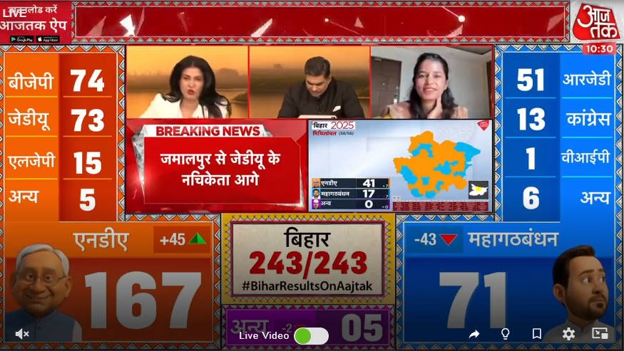 पछिल्लो अपडेट अनुसार एनडीएले २४३ सिट मध्ये १६० सिटमा अग्रता हासिल गरेको छ । त्यस्तै राष्ट्रिय जनता दलसहितको महागठबन्धनले ८० सिटमा अग्रता हासिल गरेको छ । त्यस्तै प्रशान्त किशोर नेतृत्वको जनसुराज पार्टीले २ सिटमा अग्रता बनाएको छ ।दुई चरणमा नोभेम्बर ६ र ११ मा भएको निर्वाचनको मत गणना आज बिहान ८ बजेदेखि शुरु भएको हो ।
