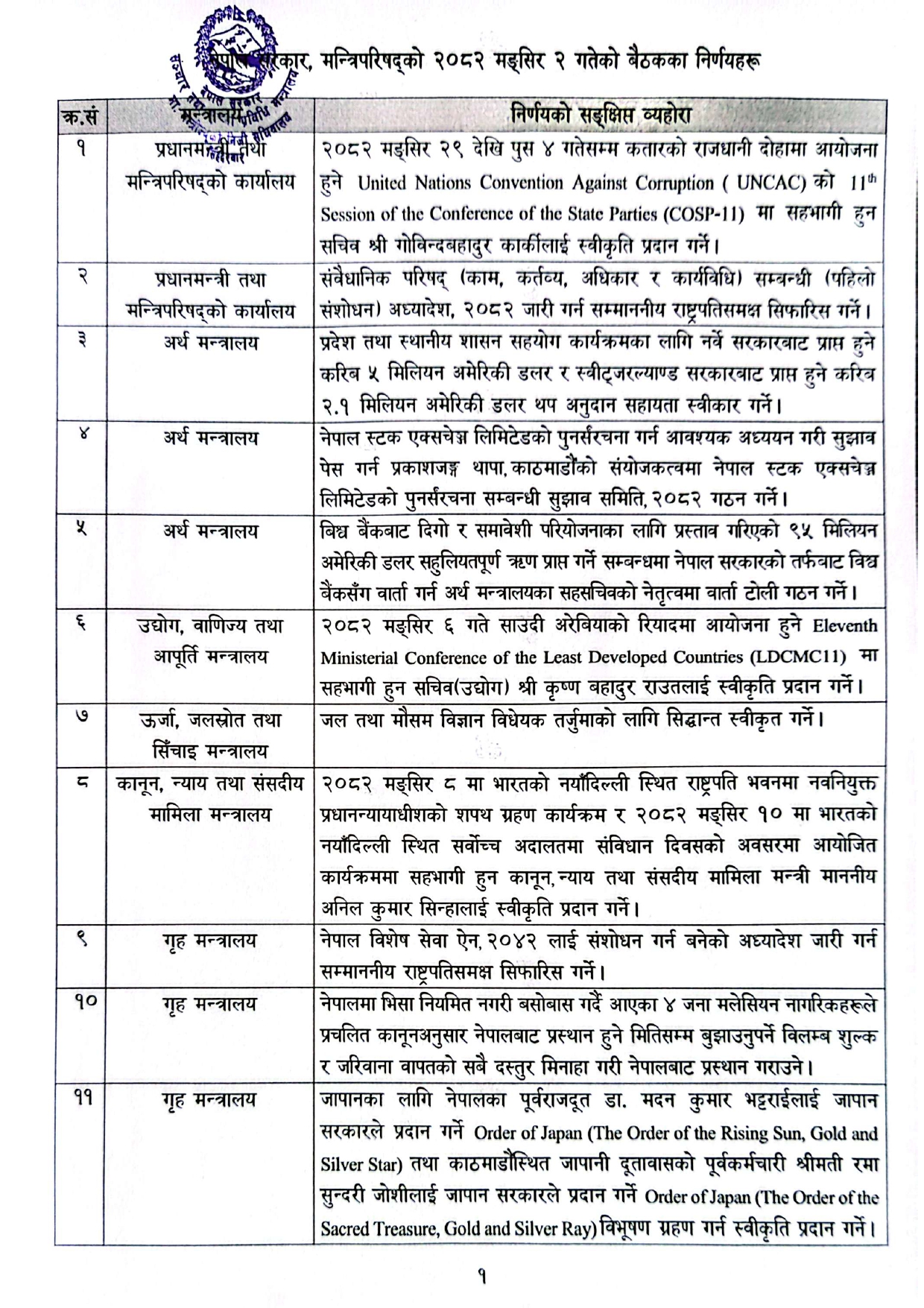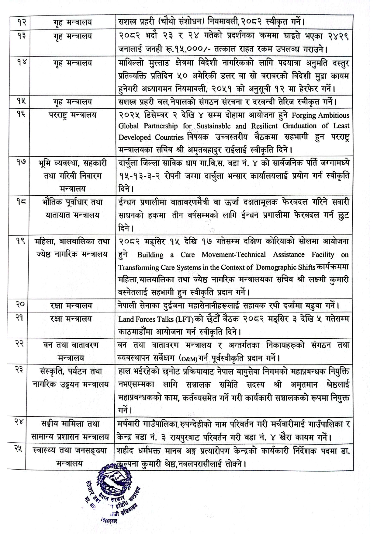 त्यस्तै मंसिर ८ गते भारतको नयाँदिल्लीस्थीत राष्ट्रपति भवनमा भारतका नवनियुक्त प्रधानन्यायाधीशको शपथ र मंसिर १० गते नयाँ दिल्लीमा नै आयोजना हुने संविधान दिवसको कार्यक्रममा सहभागी हुन कानुनमन्त्री अनिल कुमार सिन्हालाई स्वीकृत प्रदान गरिएको प्रवक्ता खरेलले बताए ।बैठकले सशस्त्र प्रहरी(चौथो संशोधन) नियमावली स्वीकृत गर्ने, सशस्त्र प्रहरी बल नेपालको संगठन संरचना र दरबन्दी तेरिज स्वीकृत गर्ने निर्णय गरेको छ भने इन्धन प्रणालीमा वातावरणमैत्री वा ऊर्जा दक्षतामूलक फेरबदल गरिने सवारी साधनको हकमा तीन वर्षसम्मको लागि इन्धन प्रणालीमा फेरबदल गर्न छुट दिने निर्णय समेत गरेको छ ।