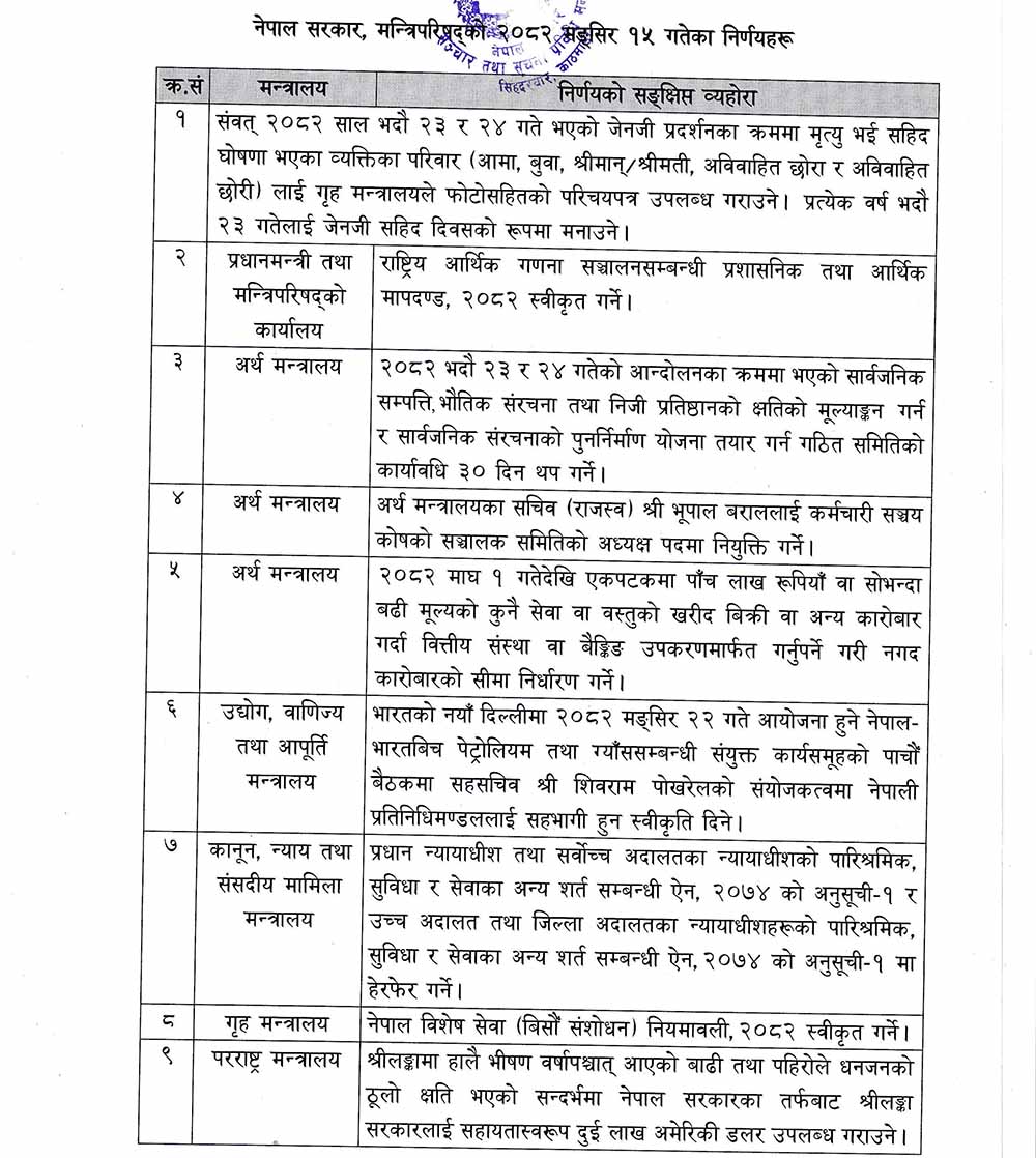 त्यसैगरी बैठकले जेनजी आन्दोलनका क्रममा सहीद भएका व्यक्तिका परिवारका आमा, बुबा, श्रीमान, श्रीमती, अविवाहित छोरी/अविवाहित छोरालाई गृहमन्त्रालयले फोटोसहितको परिचयपत्र उपलब्ध गराउने निर्णय गरेको प्रवक्ता खरेलले जानकारी दिएका छन् ।