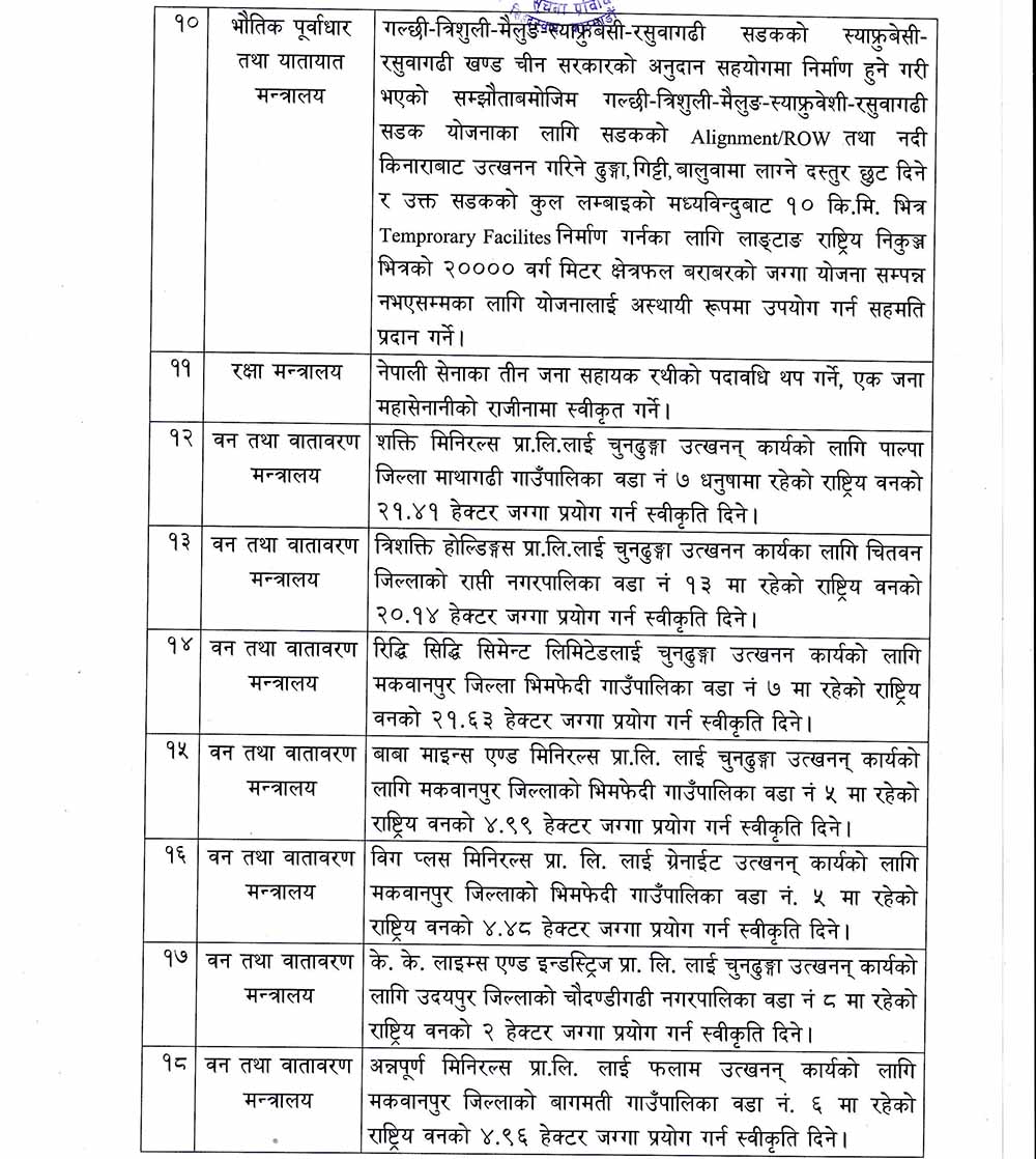 त्यस्तै सरकारले प्रेस काउन्सिल नेपालको अध्यक्ष कुमार शर्मा आचार्यलाई मनोनित गर्ने निर्णय गरेको छ । त्यसैगरी बैठकले आगामी माघ १ गतेदेखि एक पटकमा पाँच लाख रुपैयाँ वा सो भन्दा माथिको सेवा, बस्तुको खरिद बिक्री वा अन्य कारोबार गर्दा वित्तीय संस्था वा बैङ्किङ उपकरणबाट गर्नुपर्नेगरि नगद कारोबारको सीमा निर्धारण गर्ने निर्णय गरेको छ ।