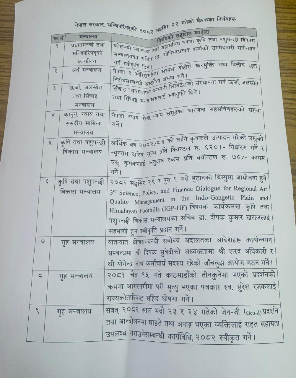 त्यस्तै नेपाल न्याय सेवा, न्याय समूहका चारजना सहसचिवहरूको सरुवा गर्ने निर्णय गरेको छ । सरकारले आर्थिक वर्ष २०८२/८३ को लागि कृषकले उत्पादन गरेको उखुको न्युनतम खरिद मूल्य प्रतिक्विन्टल ६२० रुपैयाँ निर्धारण गर्ने र उखु कृषकलाई अनुदान रकम प्रति क्वीन्टल ७० कायम गर्ने निर्णय गरेको छ ।