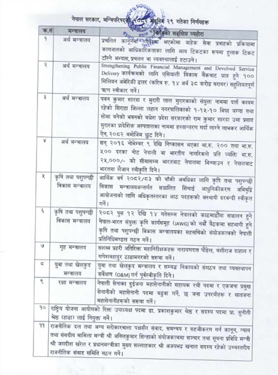 काठमाडौं । मङ्सिर २९ गते बसेको मन्त्रिपरिषद्को बैठकका निर्णयहरु सार्बजनिक गरिएको छ । सञ्चार तथा सूचना प्रविधिमन्त्री तथा सरकारका प्रवक्ता जगदीश खरेलले मन्त्रिपरिषद्को बैठकका ११ निर्णय निर्णयहरु सार्बजनिक गरेका हुन् ।