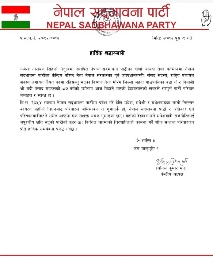 काठमाडौँ । नेपाल सद्भावना पार्टीका वरिष्ठ नेता बद्री मण्डलको निधन भएको छ । ८७ वर्षको उमेरमा उनको मंगलबार बिहान मण्डलको निधन भएको नेपाल सद्भावना पार्टीका अध्यक्ष अनिलकुमार झाले जानकारी दिएका छन् । राजा ज्ञानेन्द्र शाहको शासन कालमा उनी उपप्रधानमन्त्री पनि भएका थिए ।