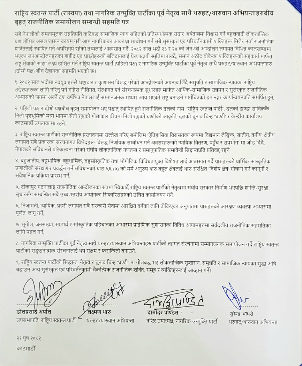 काठमाडौं । राष्ट्रिय स्वतन्त्र पार्टी (रास्वपा) र नागरिक उन्मुक्ति पार्टी (नाउपा) का पूर्वनेतृत्व तथा थरुहटरथरुवान अभियन्ताहरूबीच सोमबार बृहत् राजनीतिक समायोजनको सहमति भएको छ। स्रोतका अनुसार, सहमतिपत्रमा रास्वपाका उपसभापति डोलप्रसाद अर्याल, थरुहटरथरुवान अभियन्ता लक्ष्मण थारु, नाउपाका वरिष्ठ उपाध्यक्ष दामोदर पण्डित तथा थरुहटरथरुवान अभियन्ता सुरेन्द्र चौधरीले हस्ताक्षर गरेका छन्।