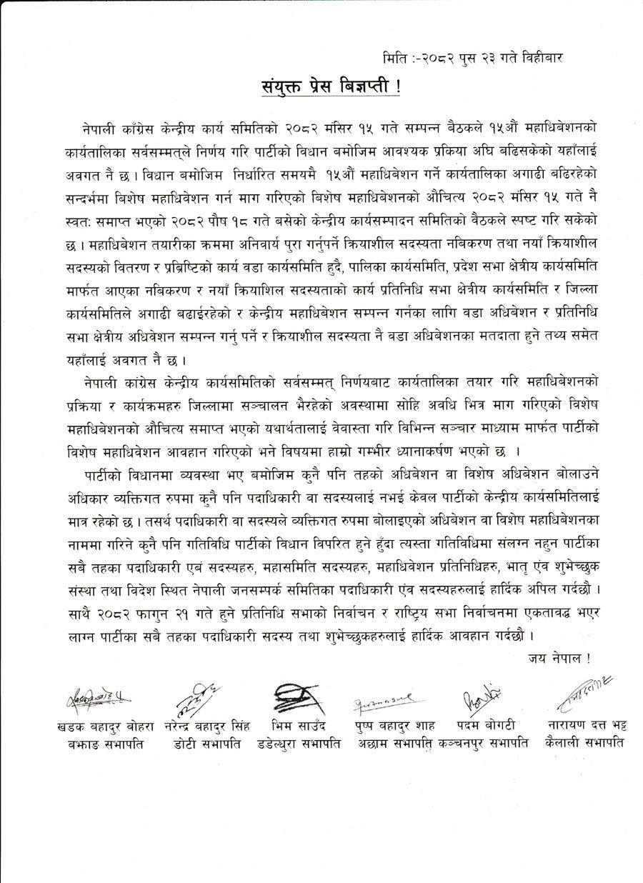 बझाङ जिल्ला सभापति खडक बहादुर बोहरा, डोटी सभापति नरेन्द्र बहादुर सिंह, डडेलधुरा सभापति भिम साउँद, अछाम सभापति पुष्पबहादुर शाह, कञ्चनपुर सभापति पदम बोगटी र कैलाली सभापति नारायणदत्त भट्टले संयुक्त विज्ञप्ति जारी गरी विशेष महाधिवेशनमा सहभागी नहुन अपील गरेका हुन् ।