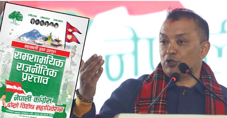 कार्यविधि पारित भएलगत्तै महामन्त्री गगन थापाले समसामायिक राजनीतिक प्रस्ताव प्रस्तुत गरेका छन्। प्रस्तुत राजनीतिक प्रस्तावमा पार्टीको आन्तरिक संगठन, नेतृत्व संरचना, आगामी निर्वाचन रणनीति, युवा सहभागिता र समसामयिक राजनीतिक परिस्थितिलाई समेट्ने विषयहरू समावेश छन्।