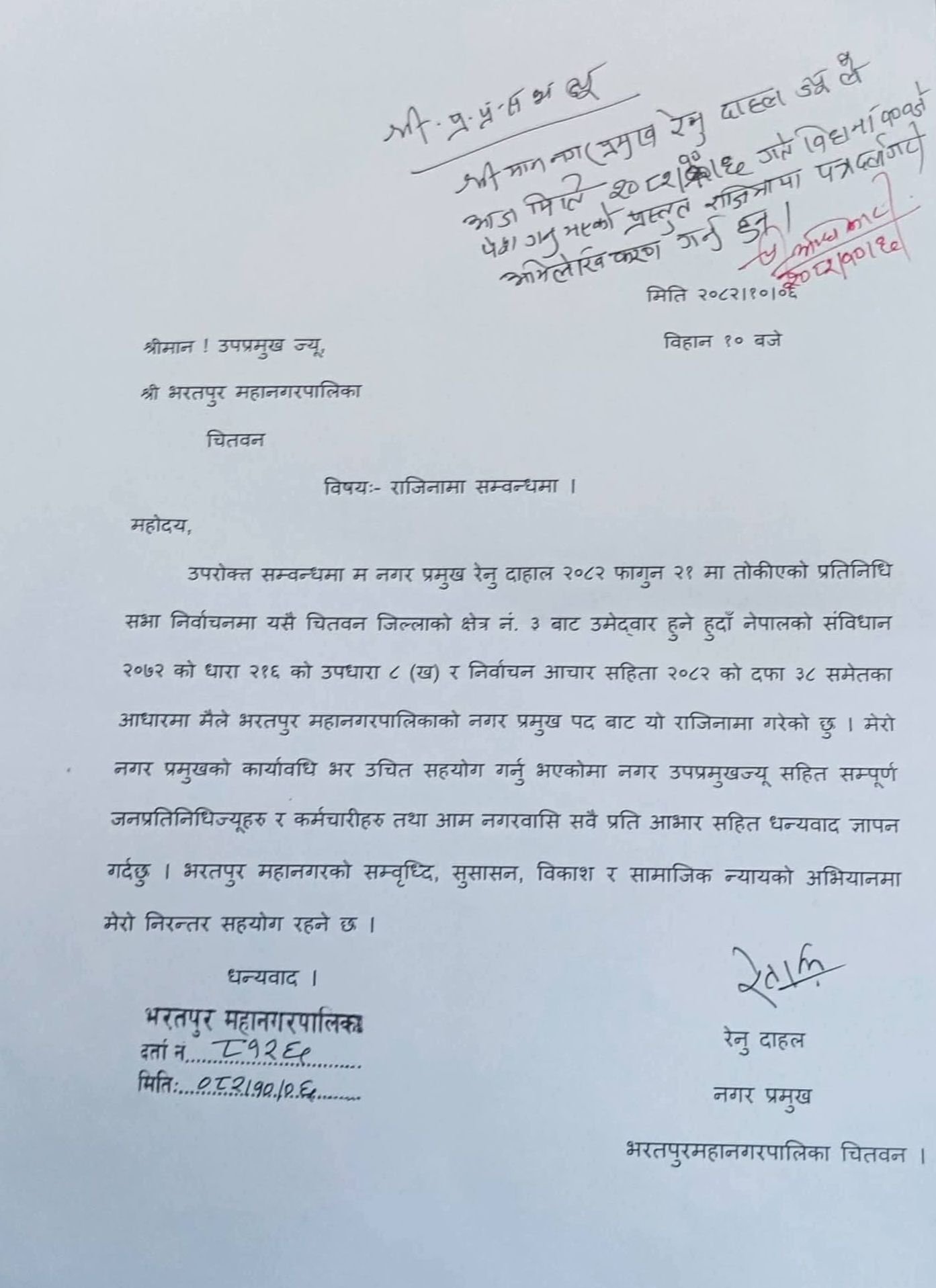भरतपुर । चितवनको भरतपुर महानगरपालिकाकी मेयर रेनु दाहालले आफ्नो पदबाट राजीनामा दिएकी छन् । लगातार २ कार्यकाल महानगरको मेयर भएकी दाहालले मंगलबार बिहान उपप्रमुख चित्रसेन अधिकारीलाई सम्बोधन गर्दै राजीनामा दिएकी हुन् ।