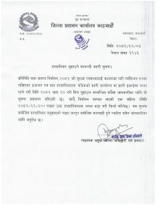 जिल्ला प्रशासन कार्यालय काठमाडौंका सहायक प्रमुख जिल्ला अधिकारी तथा प्रवक्ताद्वारा जारी सूचनामा सबै सम्बन्धित व्यक्तिहरूलाई समयमै हातहतियार बुझाउन अनुरोध गरिएको छ।