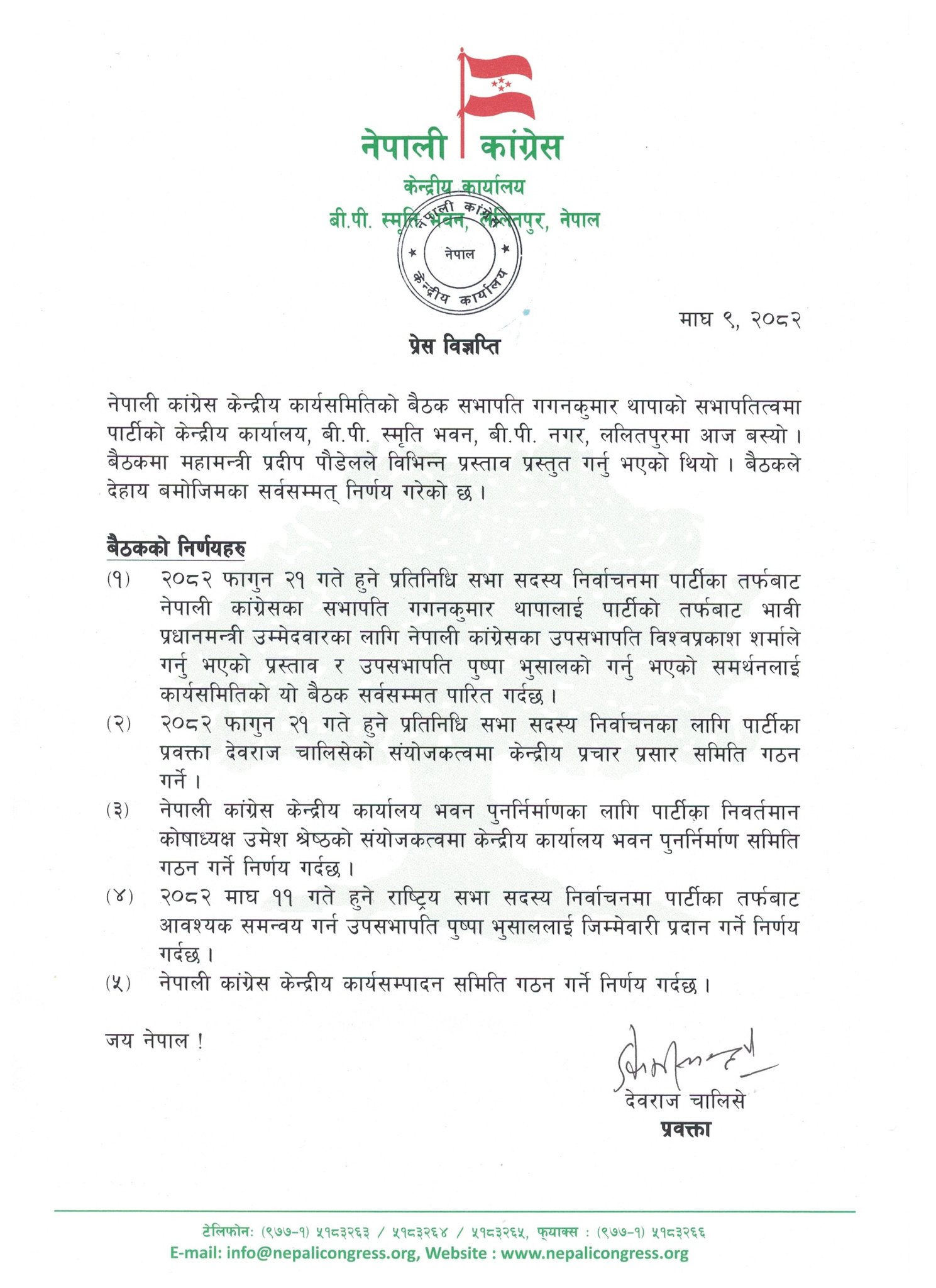 उपसभापति शर्माले आगामी फागुन २१ मा हुने आमनिर्वाचनमा काँग्रेस अबको प्रधानमन्त्री प्रस्तावित गरेर मैदानमा जान लागेको बताए । “केन्द्रीय समितिको बैठकबाट सभापति गगन थापालाई अबको प्रधानमन्त्रीका रूपमा प्रस्तुत गर्ने संस्थागत निर्णय गरेका छौँ”, उनले भने ।
