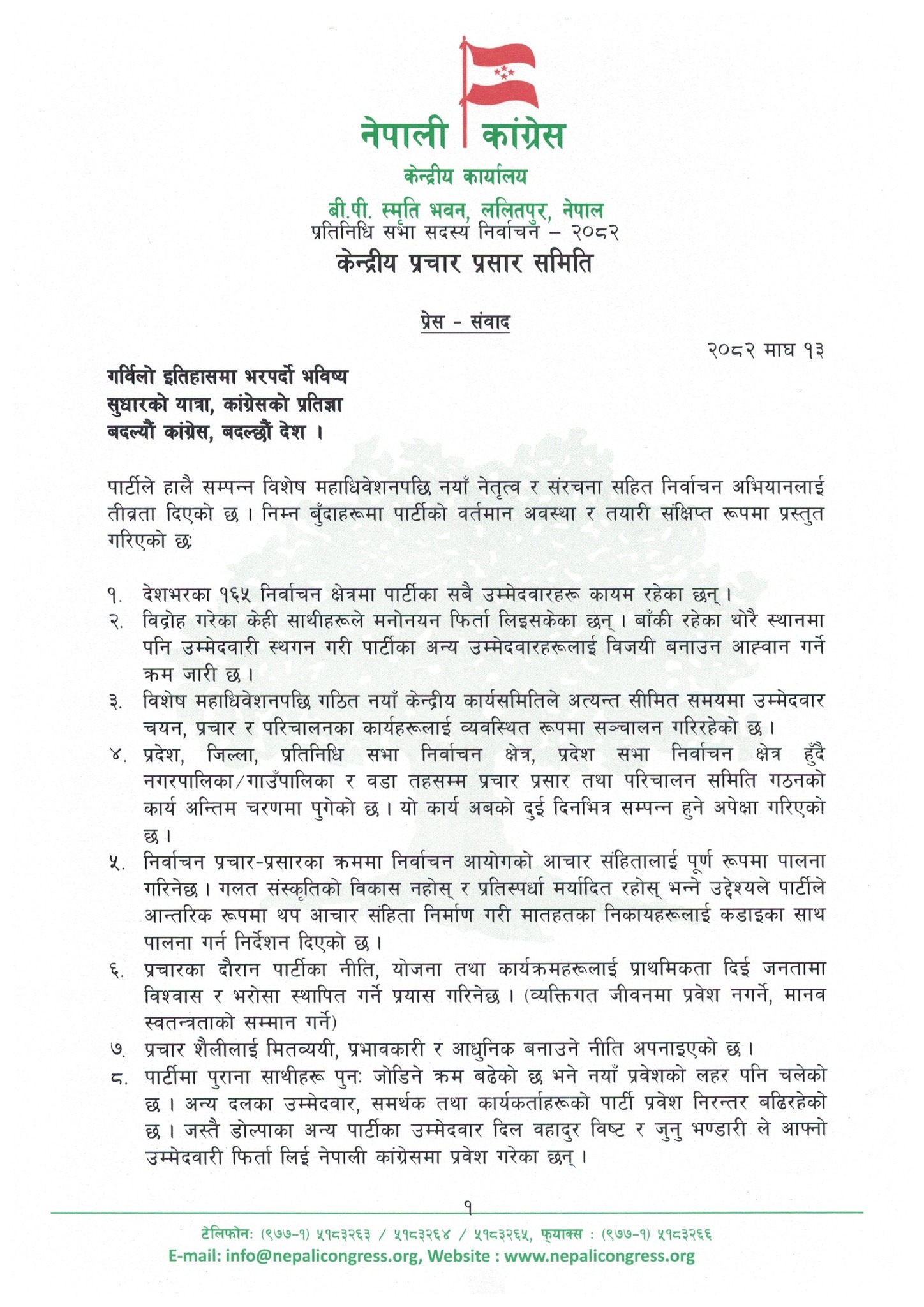 ‘गलत संस्कृतिको विकास नहोस् र प्रतिस्पर्धा मर्यादित रहोस् भन्ने उद्देश्यले पार्टीले आन्तरिक रूपमा थप आचारसंहिता निर्माण गरी मातहतका निकायहरूलाई कडाइका साथ पालना गर्न निर्देशन दिएको छ, प्रचारका दौरान पार्टीका नीति, योजना तथा कार्यक्रमहरूलाई प्राथमिकता दिई जनतामा विश्वास र भरोसा स्थापित गर्ने प्रयास गरिनेछ । कुनै पनि प्रतिपक्षी उम्मेदवारको व्यक्तिगत जीवनमा प्रवेश नगर्ने, मानव स्वतन्त्रताको सम्मान गर्ने हाम्रो नीति रहेको छ’ प्रवक्ता चालिसे भने।