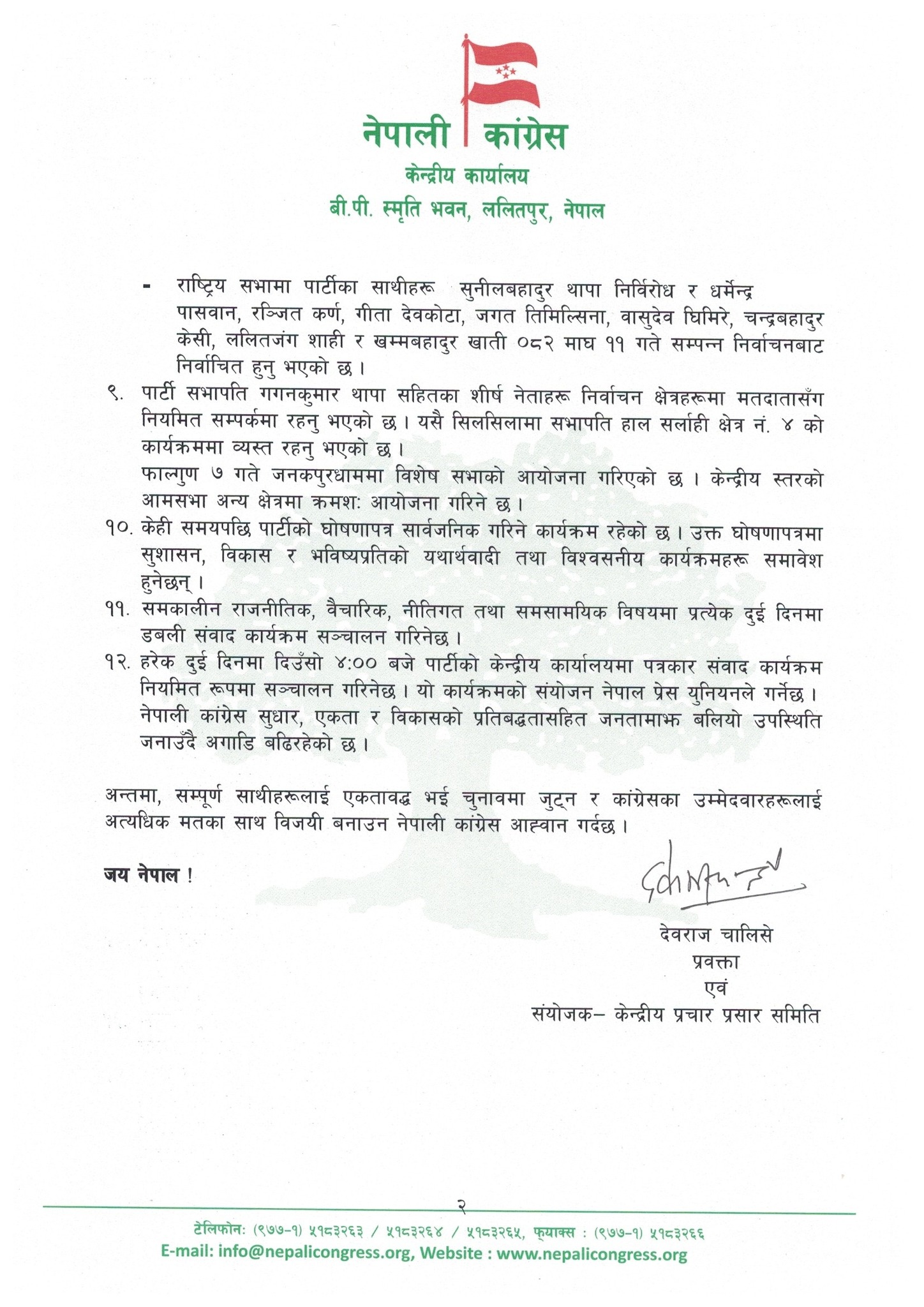 ‘कांग्रेसले गर्न सक्ने क्षमता, व्यवहारिकता र कार्यान्वयनयोग्य कार्यक्रम समेटिएको घोषणापत्र ल्याउँछ,’ प्रवक्ता चालिसेले भने, ‘घोषणापत्रमार्फत हरेक नागरिकको मन छुने, सबै वर्ग, क्षेत्र र समुदायको भावना अटाउने प्रयास गरिने छ ।’