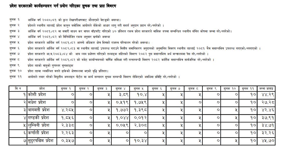 आयोगले ११ वटा सूचकका आधारमा प्रदेश सरकारहरूको मूल्यांकन गर्दा सुदूरपश्चिमले ४५.७० अंकसहित पहिलो स्थान हासिल गरेको हो। कोशी प्रदेश ४४.२९ अंकसहित दोस्रो र वागमती प्रदेश ४२।२६ अंकसहित तेस्रो स्थानमा छन्। त्यसपछि क्रमशः गण्डकी ३७.९१, लुम्बिनी ३४.७१, कर्णाली ३२.२६ र मधेश प्रदेश २७.२८ रहेका छन्।