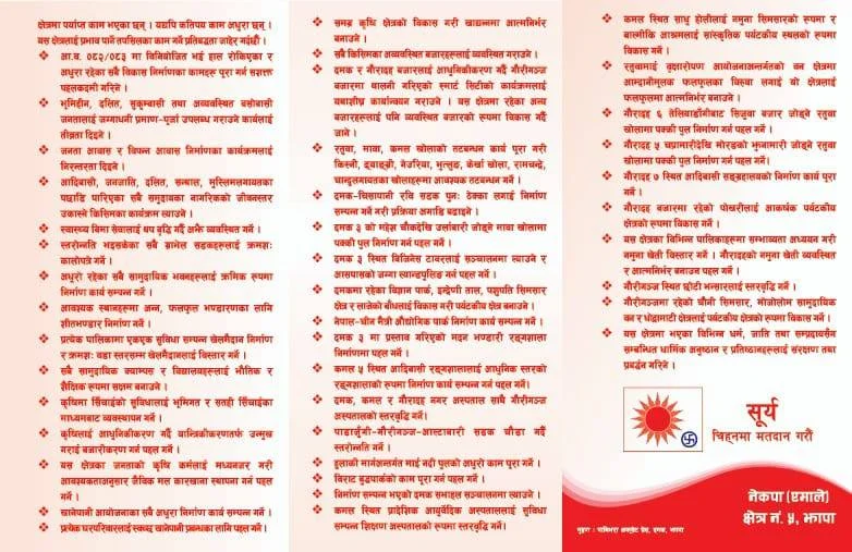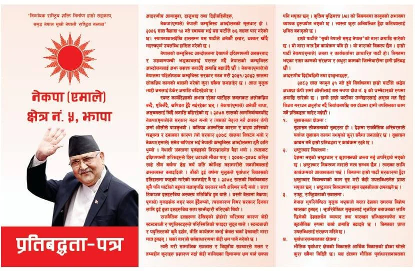 दमक । आसन्न प्रतिनिधिसभा निर्वाचनलाई लक्षित गरि नेकपा एमालेका अध्यक्ष केपी शर्मा ओलीको उम्मेदवारी रहेको झापा क्षेत्र नंं ५ लाई केन्द्रित ४२ बुदे प्रतिवद्धता पत्र सार्वजनिक गरिएको छ ।
