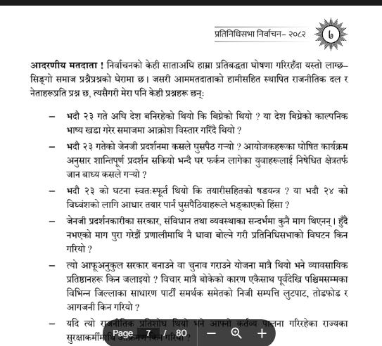 ४- जेनजी प्रदर्शनकारीका सरकार, संविधान तथा व्यवस्थाका सन्दर्भमा कुनै माग थिएनन् । हुँदै नभएको माग पुरा गरेझैं प्रणालीमाथि नै धावा बोल्ने गरी प्रतिनिधिसभाको विघटन किन गरियो ?