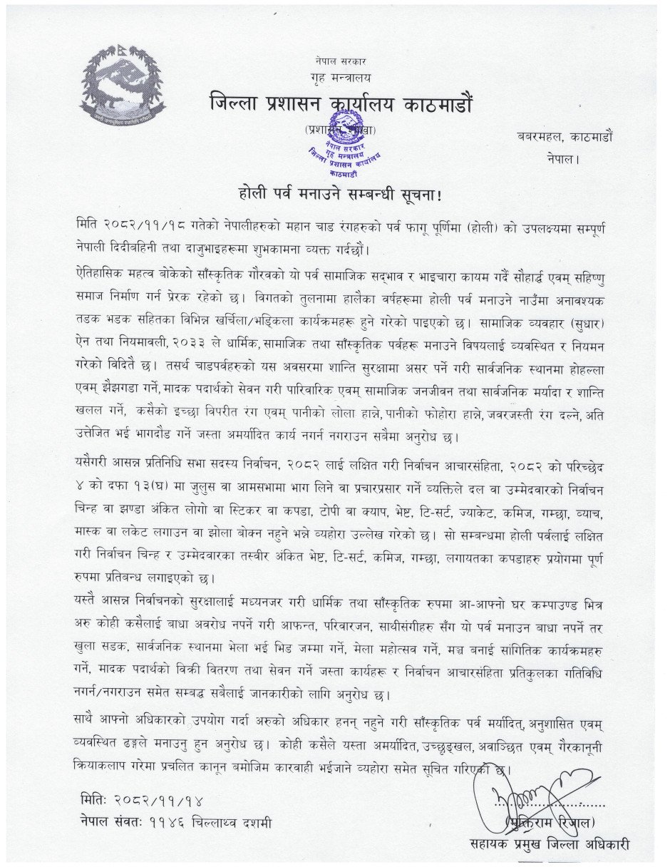 काठमाडौं । स्थानीय प्रशासनले होली पर्व मर्यादित, अनुशासित र सुरक्षित ढंगले मनाउन आग्रह गरेको छ । जिल्ला प्रशासन कार्यालय काठमाडौंले सूचना जारी गरी निर्वाचन आचारसंहिता र सुरक्षा संवेदनशीलताको कारण होली पर्वलाई थप मर्यादित बनाउन आग्रह गरेको हो ।