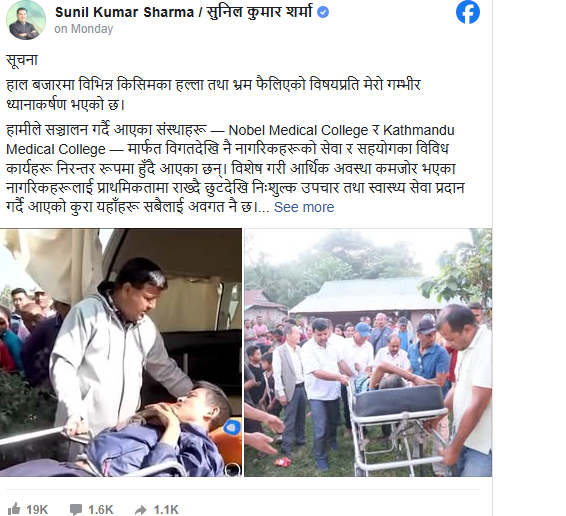 उनका अनुसार नोबेल मेडिकल कलेज र काठमाडौं मेडिकल कलेजमार्फत लामो समयदेखि सञ्चालन हुँदै आएको निःशुल्क तथा सहुलियत उपचार कार्यक्रम आगामी दिनहरूमा पनि यथावत् रहनेछ। उनले चुनावी हार–जित र सामाजिक सेवाबीच कुनै सम्बन्ध नहुने उल्लेख गर्दै समाज र राष्ट्रप्रतिको दायित्वलाई निरन्तरता दिने बताए।