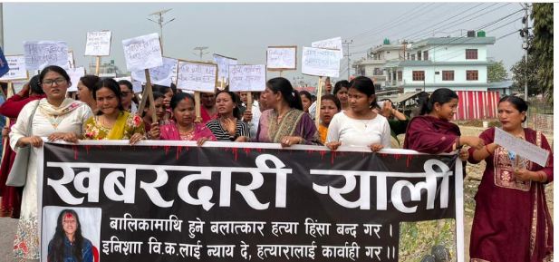 काठमाडौं । प्रदेश राजधानी वीरेन्द्रनगर नगरपालिका वडा न. १ निवासी १६ वर्षीय इमिसा विकको बलात्कारपछि हत्या भएको घटनाको विरोधमा परिवार र अधिकारकर्मीले प्रदर्शन गरेका छन्। प्रदर्शनकारीहरूले निष्पक्ष छानबिन र दोषीमाथि तत्काल कारबाहीको माग गर्दै मंगलगढी चोकबाट र्याली सुरु गरी जिल्ला प्रशासन कार्यालय पुगेर ध्यानाकर्षण पत्र बुझाएका छन्। त्यसपछि जिल्ला प्रहरी कार्यालय अगाडि धर्ना दिइरहेका छन् ।