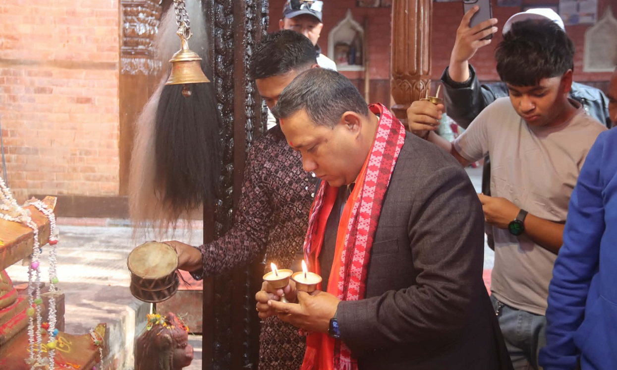 काठमाडौं । परराष्ट्रमन्त्री शिशिर खनालले मनमैजु मन्दिरको दर्शन तथा पूजाअर्चना गरेका छन् ।आज बिहान तारकेश्वर नगरपालिका–९ मनमैजु मन्दिरमा पुगेर उनले पूजाअर्चना गरेका हुन् । मन्त्री खनालले अन्य दर्शनार्थीजस्तै लाइनमा बसेर पूजा गरेका थिए ।