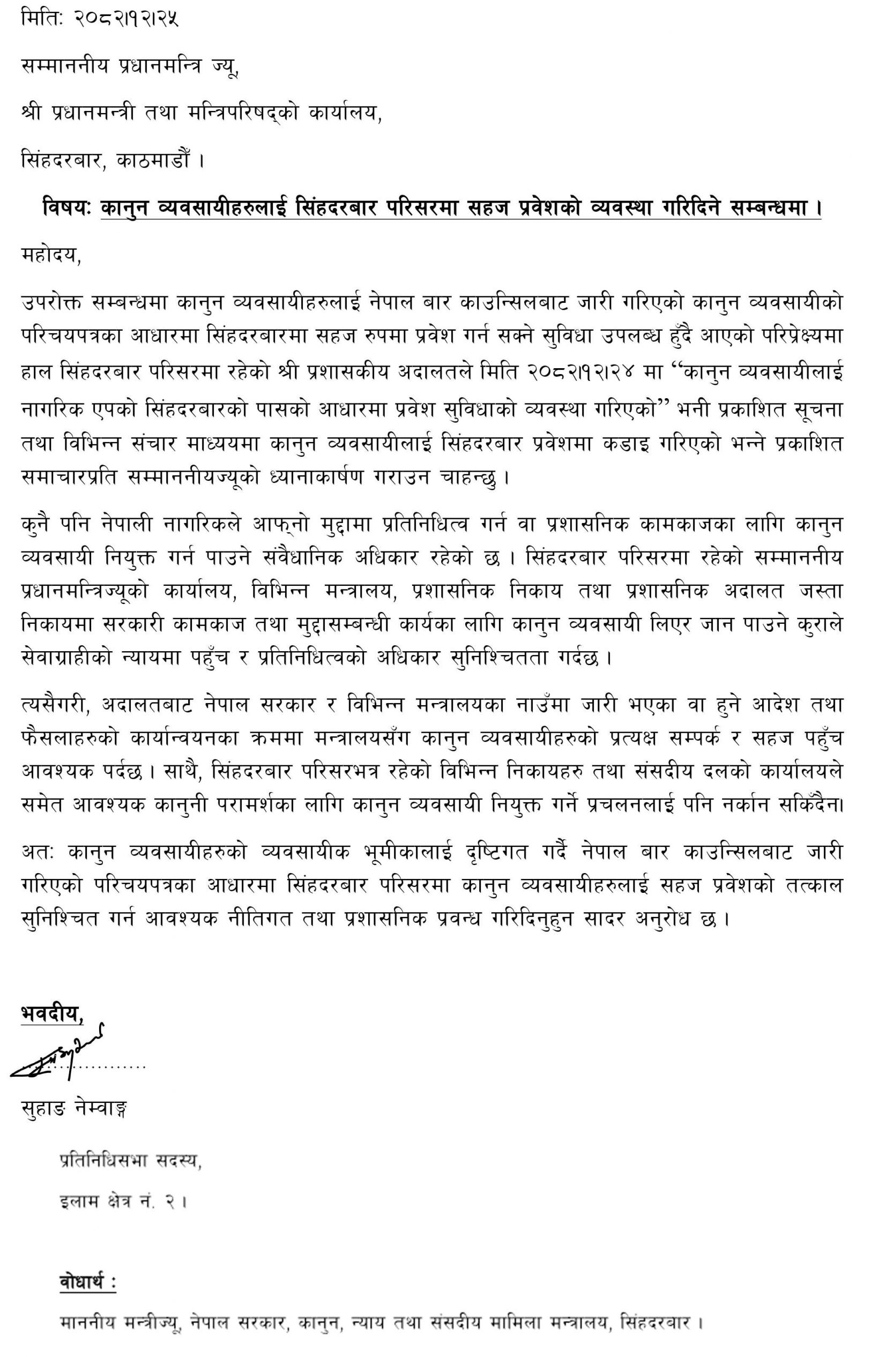पत्रमा उनले कुनै पनि नेपाली नागरिकले आफ्नो मुद्दामा कानुन व्यवसायीमार्फत प्रतिनिधित्व गराउने संवैधानिक अधिकार सुनिश्चित रहेको उल्लेख गरेका छन्। सो अधिकारको प्रभावकारी कार्यान्वयनका लागि सिंहदरबारस्थित विभिन्न निकायमा कामकाज गर्न कानुन व्यवसायीको सहज पहुँच आवश्यक पर्ने उनले बताएका छन्।