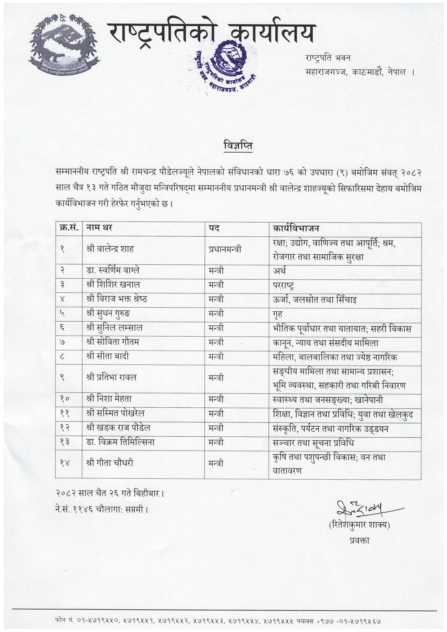 राष्ट्रपतिको कार्यालयका अनुसार प्रधानमन्त्री साहको सिफारिसमा यही चैत १३ गते गठित मन्त्रिपरिषद्मा हेरफेर गरिएको हो ।