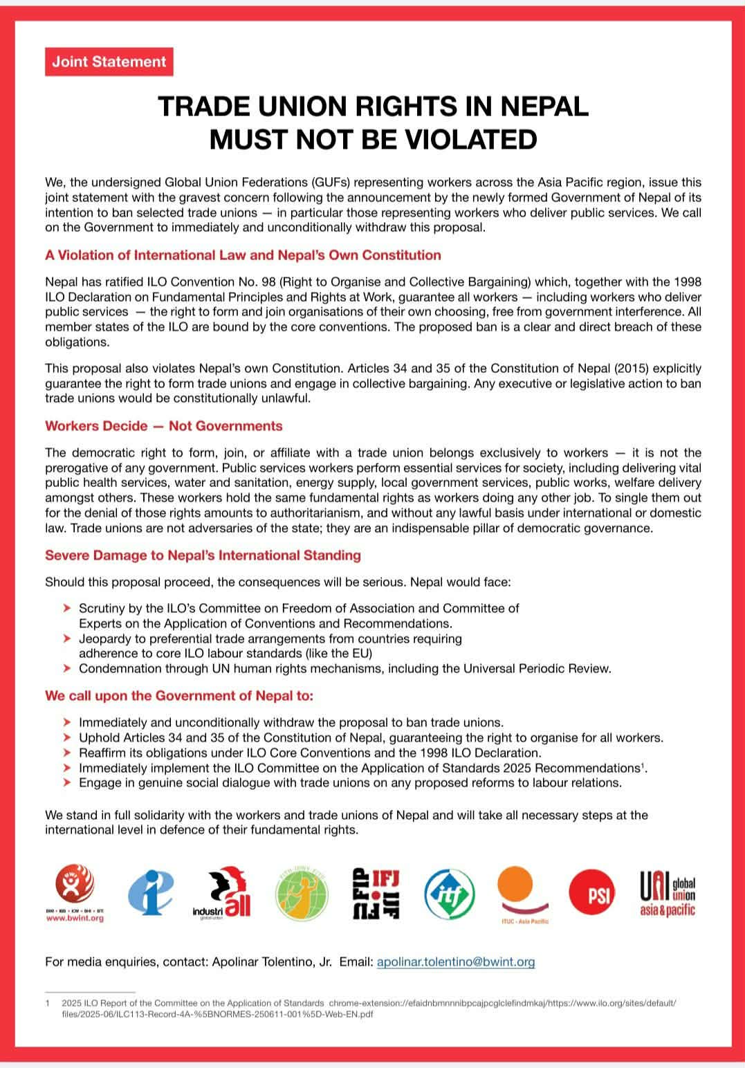 उनीहरूले नेपाल सरकारलाई ट्रेड युनियन प्रतिबन्ध प्रस्ताव फिर्ता लिन, संविधान तथा ILO महासन्धिअनुसारका दायित्व पालना गर्न, ‘एप्लिकेसन अफ स्ट्यान्डर्ड्स २०२५’ का सिफारिसहरू कार्यान्वयन गर्न तथा श्रम सुधारका विषयमा ट्रेड युनियनहरूसँग वास्तविक सामाजिक संवाद गर्न आह्वान गरेका छन्।