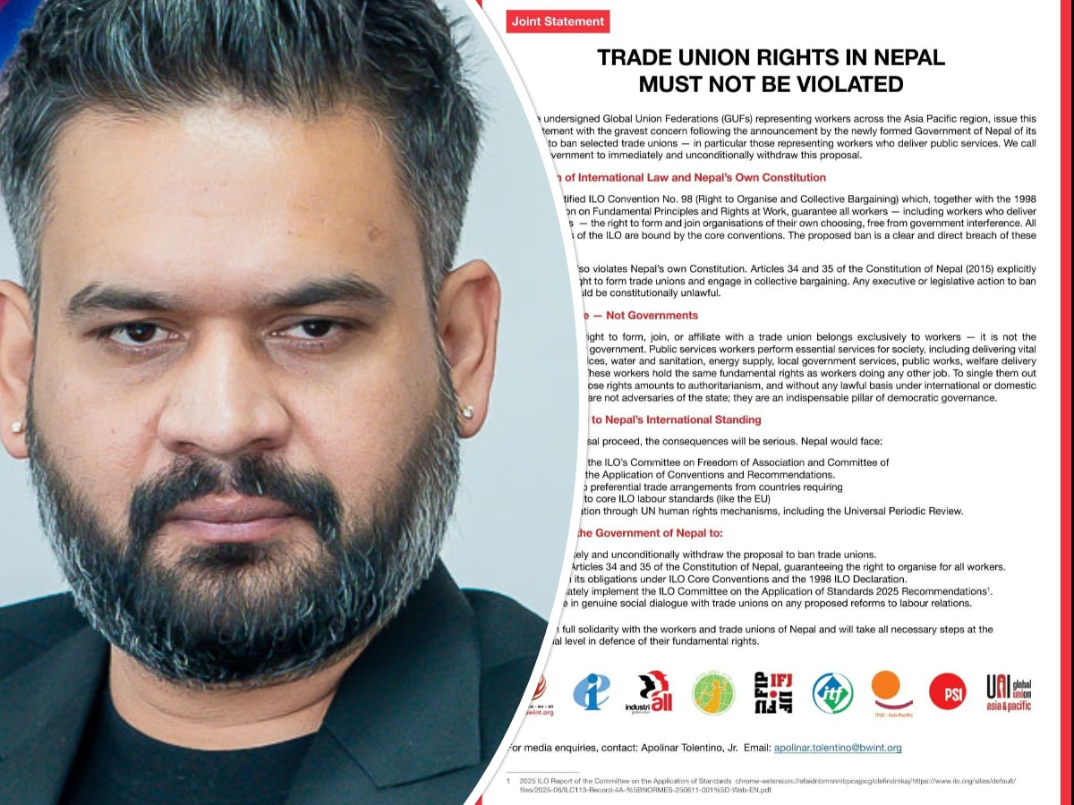 काठमाडौँ । एसिया–प्रशान्त क्षेत्रका श्रमिकहरूको प्रतिनिधित्व गर्ने विभिन्न ग्लोबल युनियन फेडेरेसनहरू (GUFs) ले नेपालमा ट्रेड युनियन अधिकारमाथि हस्तक्षेप हुन नहुने भन्दै सरकारको प्रस्तावित कदमप्रति गम्भीर चिन्ता व्यक्त गरेका छन्।