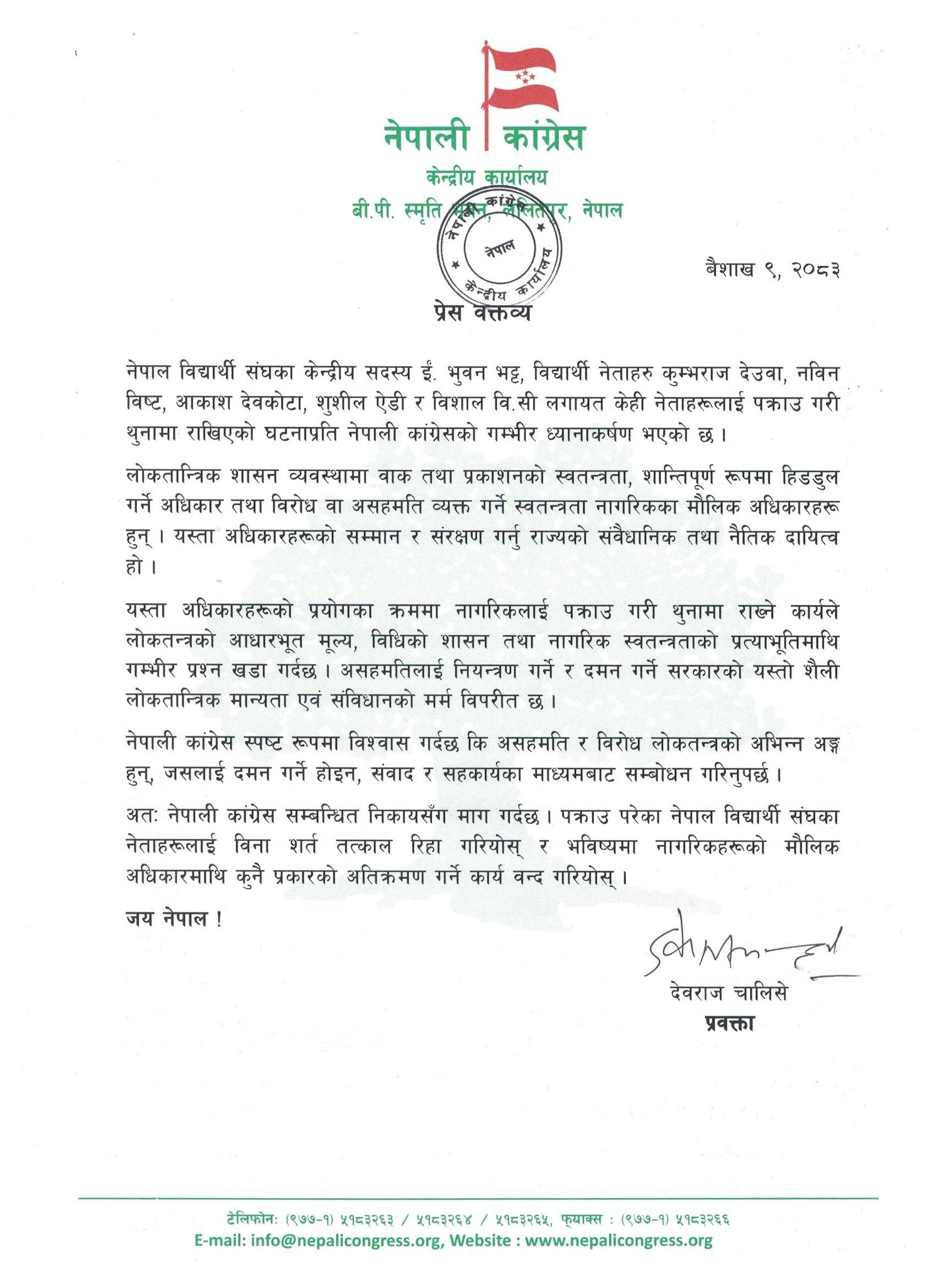 कांग्रेसका प्रवक्ता देवराज चालिसेद्वारा जारी प्रेस वक्तव्यमा केन्द्रीय सदस्य ईं. भुवन भट्टसहित कुम्भराज देउवा, नविन विष्ट, आकाश देवकोटा, शुशील ऐडी र विशाल वि.सी लगायत विद्यार्थी नेताहरूलाई पक्राउ गर्नु लोकतान्त्रिक मूल्यविपरीत भएको उल्लेख गरिएको छ ।