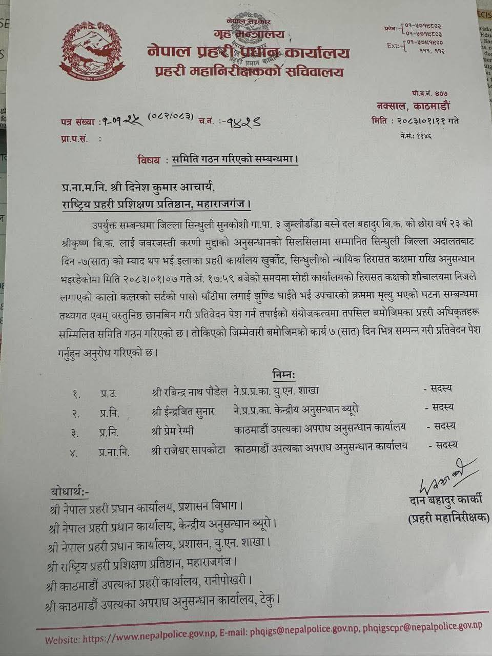प्रहरीले समितिलाई ७ दिनभित्र प्रतिवेदन बुझाउन निर्देशन दिएको छ ।
