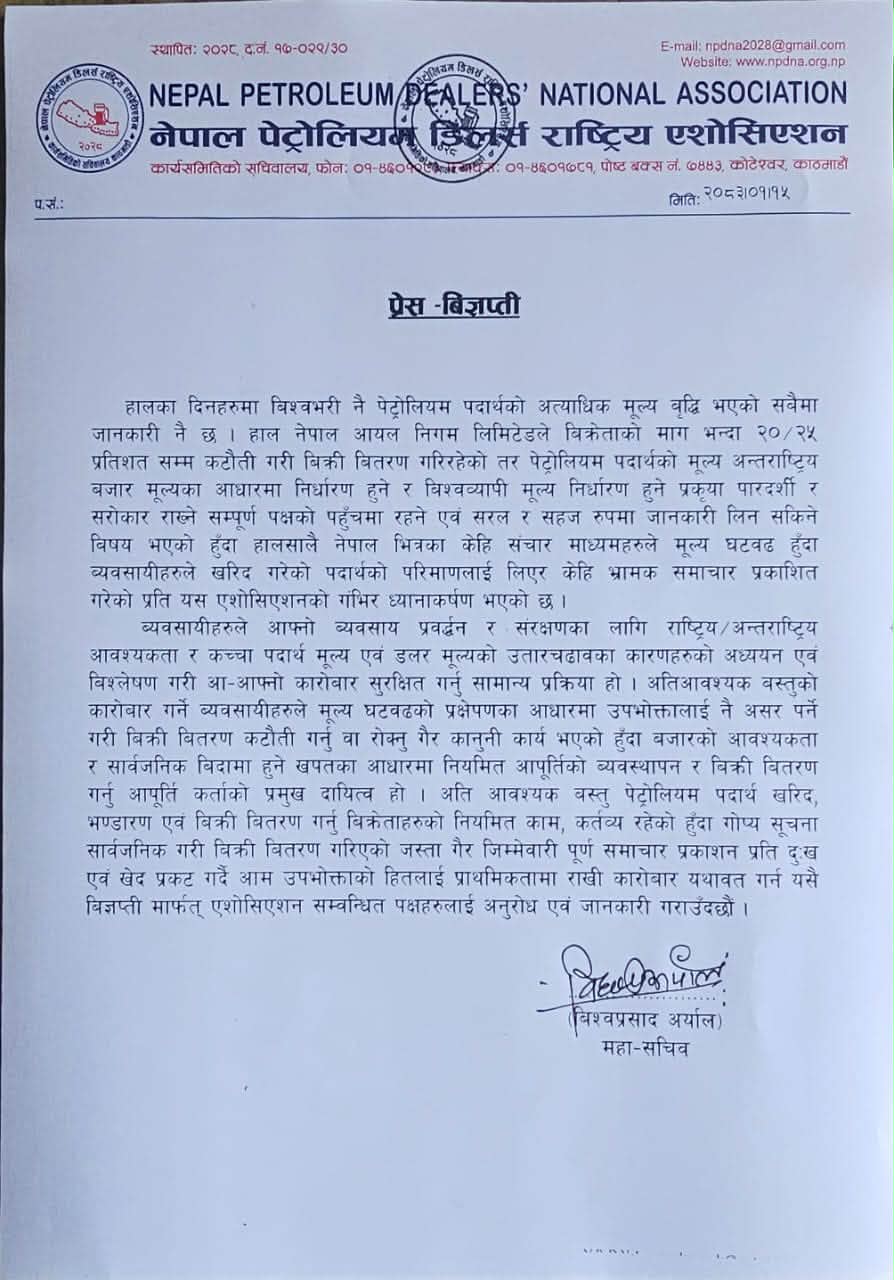 काठमाडौं । नेपाल पेट्रोलियम डिलर्स राष्ट्रिय एशोसिएशनले पछिल्लो समय केही सञ्चारमाध्यममा प्रकाशित पेट्रोलियम पदार्थको खरिद–बिक्री तथा मौज्दात सम्बन्धी समाचारप्रति आपत्ति जनाएको छ।