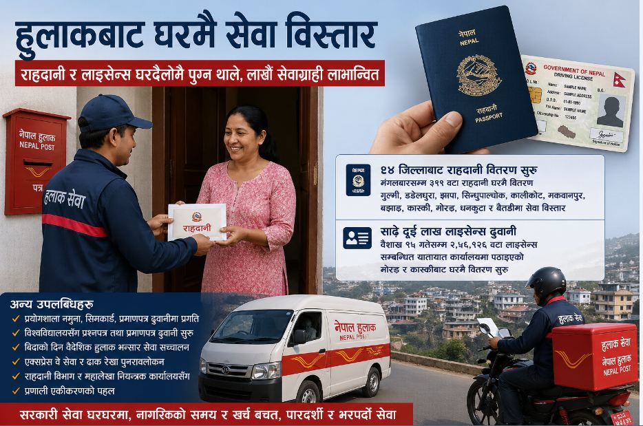 काठमाडौँ । सरकारी सेवा घरमै उपलब्ध गराउने उद्देश्यले हुलाक सेवा विभागमार्फत पहिलो चरणमा राहदानी र सवारीचालक अनुमतिपत्र (लाइसेन्स) वितरणमा उल्लेखनीय प्रगति देखिएको छ। हुलाक सेवा विभागकी महानिर्देशक मनमाया भट्टराई पँगेनीका अनुसार पछिल्लो एक महिनामा सेवा…
