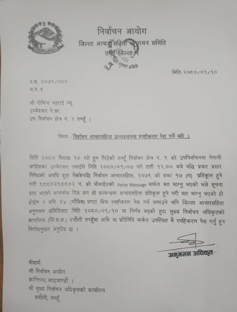 भट्टराईले ९८८०२९८८०२ नम्बरको मोबाइलको भ्वाइस म्यासेजमार्फत मत मागेको उजुरीको आधारमा मत स्पष्टीकरणमा सोधिएको हो । ‘सो सम्बन्धमा आचारसंहिता प्रतिकूल हुने गरी मत माग्नु भएको हो होइन ? २४ घन्टाभित्र मुख्य निर्वाचन अधिकृतको कार्यालयमा आफै वा प्रतिनिधिमार्फत उपस्थित भई स्पष्टीकरण पेस गर्नु,’ समितिले पत्रमा भनेको छ ।