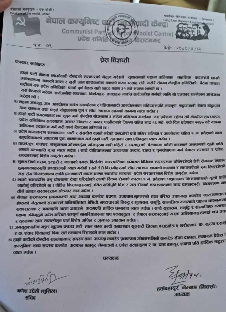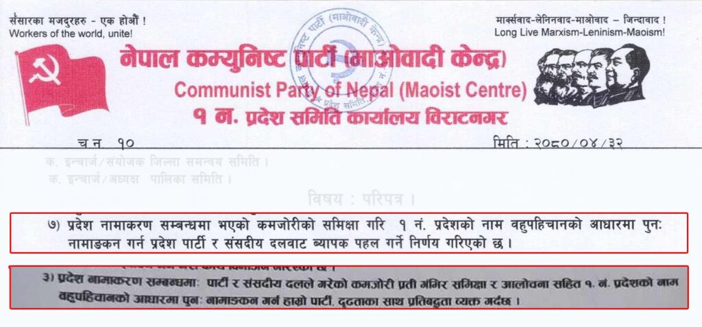 माओवादीले आफ्ना निर्णय सार्वजनिक गर्न आयोजना गरेको पत्रकार सम्मेलनमा पनि नामकरणको विषयमा उल्लेख छ । ‘प्रदेश नामकरण सम्बन्धमा पार्टी र संसदीय दलले गरेको कमजोरीप्रति गम्भीर समीक्षा र आत्मालोचना सहित १ नं. प्रदेशको नाम बहुपहिचानको आधारमा पुनः नामाङ्कन गर्न हाम्रो पार्टी, दृढताका साथ प्रतिबद्धता व्यक्त गर्दछ,’ विज्ञप्तिको ३ नम्बर बुँदामा उल्लेख छ ।