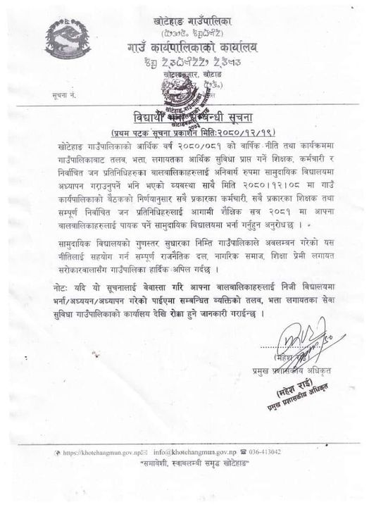 सूचनालाई वेवास्ता गरि आफ्ना बालबालिकाहरुलाई निजी विद्यालयमा भर्ना र अध्ययनरअध्यापन गरेको पाईएमा सम्बन्धित व्यक्तिको तलब, भत्ता लगायतका सेवा सुविधा गाउँपालिकाको कार्यालय देखि रोक्का हुने खोटेहाङ गाउँपालिकाका प्रमुख प्रशासकीय अधिकृत महेश राईले जारी गरेको विज्ञप्तीमा उल्लेख गरिएको छ ।