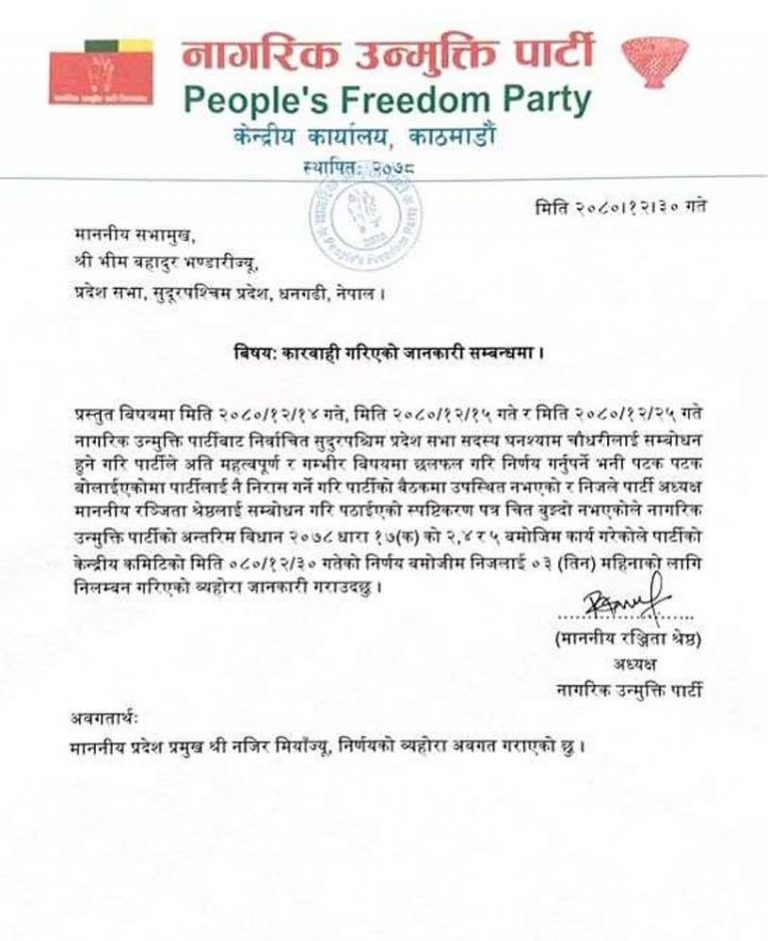 शुक्रबार पार्टी अध्यक्ष रन्जिता श्रेष्ठले सभामुख भिमबहादुर भण्डारीलाई पत्र पठाउँदै प्रदेश सभा सदस्य चौधरीलाई तीन महिनाका लागि निलम्बन गरिएको उल्लेख गरिन् । पार्टीले गरेको निर्णय नमानेको भन्दै नागरिक उन्मुक्ती पाटी अध्यक्ष श्रेष्ठले असन्तुष्टि व्यक्त गर्दै आएकी थिइनु् । अध्यक्षलाई बुझाएको स्पष्टीकरण समेत चित्त बुझ्दो नभएकाले चैत्र ३० गते पार्टी केन्द्रीय कमिटीको निर्णय बमोजिम चौधरीलाई निलम्बन गरिएको पत्रमा उल्लेख गरिएको छ ।