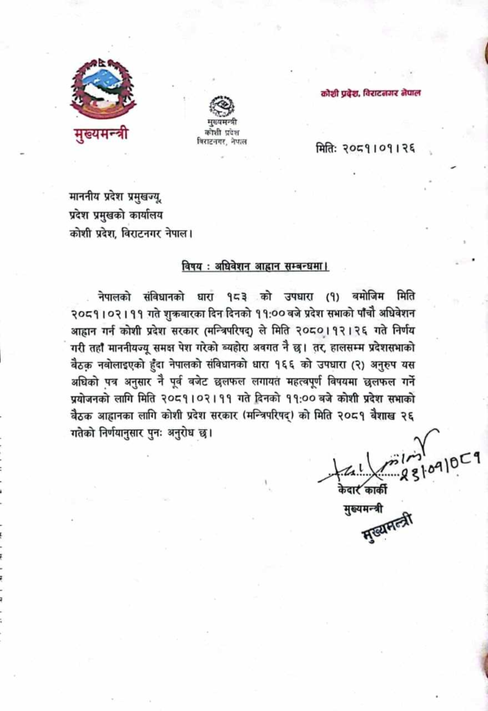 प्रदेशमा नयाँ सरकार गठनका लागि प्रदेश प्रमुखलाई दबाब दिइरहेका बेला संसद अधिवेशन आह्वान गर्न प्रदेश प्रमुखलाइ स्मरण गराएको हो। कोशी प्रदेशमा माओवादी र एमाले नयाँ सरकार गठनको पहलमा जुटेका छन् । तर मुख्यमन्त्री कार्की एक पटक विश्वासको मत लिइसेकाले अर्को पटक विश्वासको मत लिन नपर्ने बताउँदै आएका छन ।