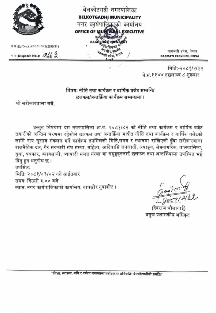 आगामी आर्थिक वर्षको नीति तथा कार्यक्रम र वार्षिक वजेट अन्तिम चरणमा रहेकोले छलफल तथा अन्तर्क्रिया तथा राय सुझाव संकलनका लागि नगरपालिकाले सरोकारवाला राजनैतिक दल, गैर सरकारी संघ संस्था, महिला, आदिवासि जनजाती, अपाङ्ग, जेष्ठनागरिक, वालवालिका, युवा, पत्रकार, व्यावसायी, व्यापारी संलग्न संस्था वा समुहहरुलाई छलफल तथा अन्तर्क्रियामा उपस्थित हुन अनुरोध गरेको छ ।