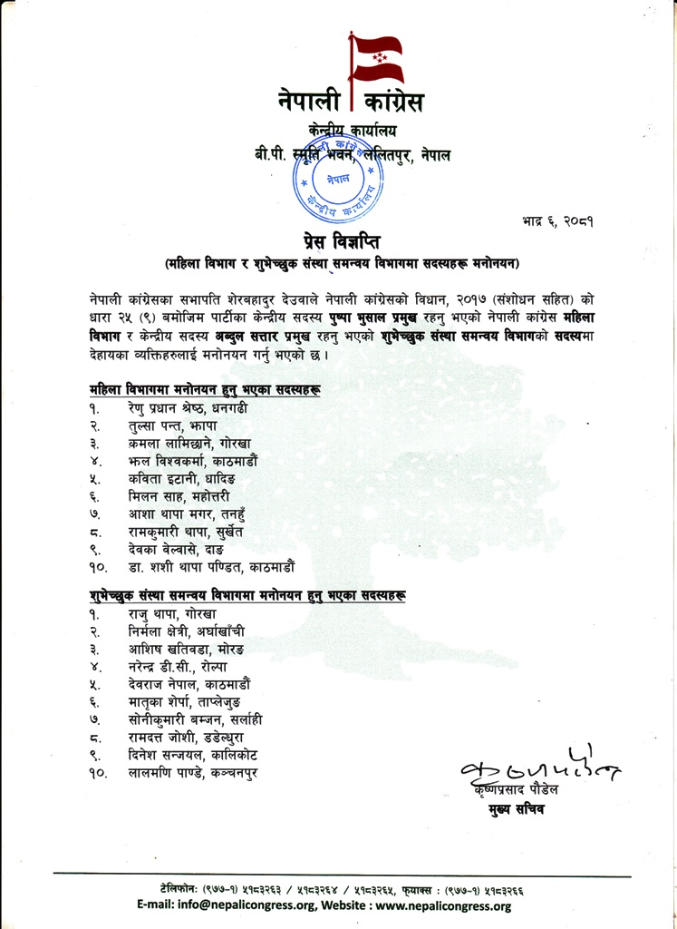 कांग्रेसले महिला विभागमा रेणुप्रधान श्रेष्ठ (धनगढी), तुल्सा पन्त (झापा), कमला लामिछाने (गोरखा), झल विश्वकर्मा (काठमाडौँ), कविता इटानी (धादिङ), मिलन साह (महोत्तरी), आशा थापा मगर (तनहुँ), रामकुमारी थापा (सुर्खेत), देवका वेल्वासे (दाङ) र डा शशी थापा पण्डित (काठमाडौँ) लाई मनोनयन गरिएको कांग्रेस केन्द्रीय कार्यालयका मुख्यसचिव कृष्णप्रसाद पौडेलले जानकारी दिए ।
