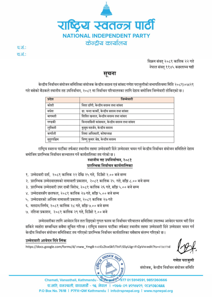 कात्तिक २२ देखि २५ गते दिउँसो २ बजेसम्म उम्मेदवारी दर्ताको कार्यक्रम राखेर नामावली प्रकाशन, दाबी विरोधलगायतको प्रक्रिया पूरा गरेर कात्तिक २७ गते उम्मेदवारको अन्तिम नामावली प्रकाशित गरिने रास्वपाले जनाएको छ ।