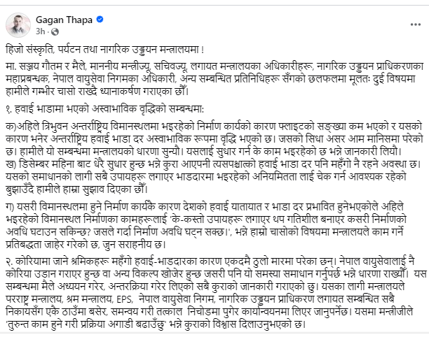 काठमाडौं । नेपाली कांग्रेसका महामन्त्री गगन थापा र केन्द्रीय सदस्य सञ्जय गौतमले हवाई क्षेत्रमा देखिएका समस्या समाधान गर्न संस्कृति, पर्यटन तथा नागरिक उड्डयन मन्त्रालयको ध्यानाकर्षण गराएका छन् । महामन्त्री थापाले संस्कृति, पर्यटन तथा नागरिक उड्डयन मन्त्री बद्री पाण्डे र नियामक निकायका अधिकारीहरुलाई मन्त्रालयमा भेटेर हवाई भाडा वृद्धिबारे ध्यानाकर्षण गराएका हुन् ।