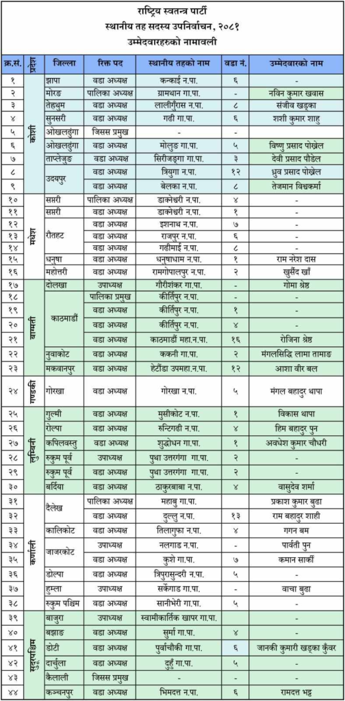 काठमाडौं । राष्ट्रिय स्वतन्त्र पार्टीले उपनिर्वाचन हुने ४२ मध्ये २६ स्थानमा आफ्ना उम्मेदवार खडा गरेको छ । काठमाडौंको कीर्तिपुर नगरपालिकामा भने रास्वपाले उम्मेदवारी दिएन ।