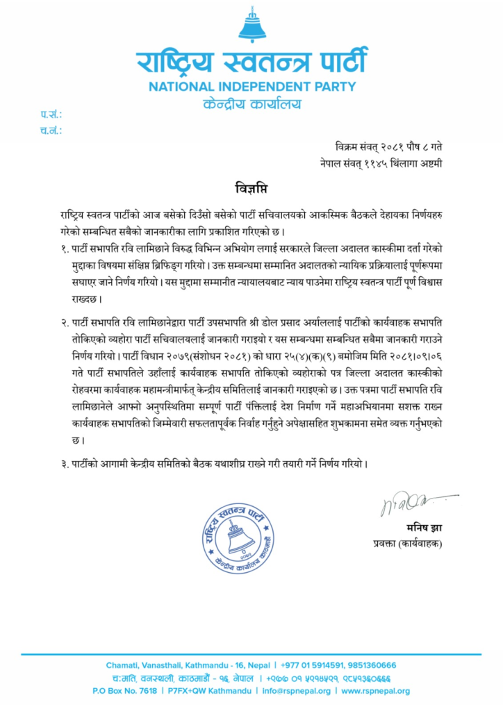पार्टी सभापति रवि लामिछानेविरुद्ध कास्की जिल्ला अदालतमा आइतबार मुद्दा दर्ता भएको थियो । आइतबार नै सभापति लामिछानेलाई सांसद पदबाट निलम्बन गर्न कास्की प्रहरीले सङ्घीय संसद् सचिवालयलाई पत्र पठाइसकेको छ ।
