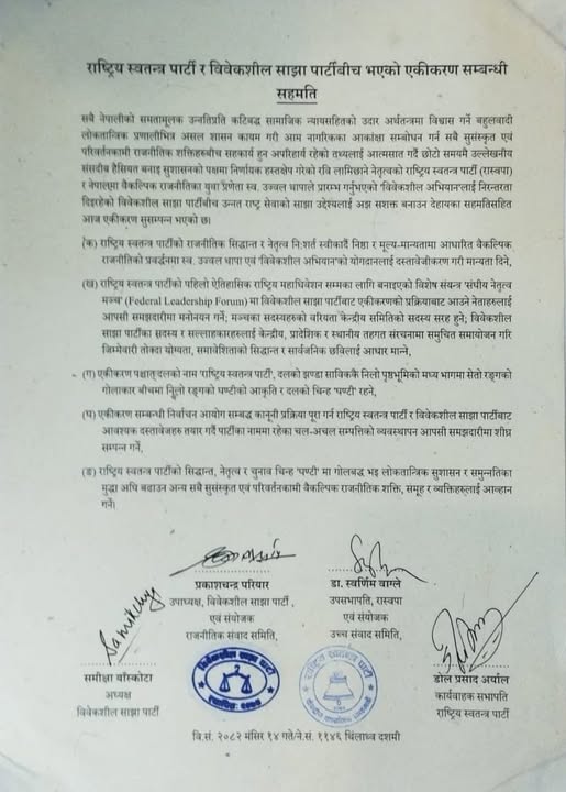 एकता सहमति पत्रमा— रास्वपा तर्फबाट कार्यबाहक अध्यक्ष डोलप्रसाद अर्याल, उपाध्यक्ष स्वर्णिम वाग्ले र विवेकशील साझा तर्फबाट अध्यक्ष समीक्षा बास्कोटा, उपाध्यक्ष प्रकाशचन्द्र परियारले हस्ताक्षर गरी एकता औपचारिक रूपमा टुंग्याए। यससँगै दुवै पार्टी अब एउटै संगठनात्मक संरचना र साझा राजनीतिक दृष्टि अन्तर्गत अघि बढ्नेछन्।संगठनगत नाम जस्तै चुनाव चिन्ह ‘घण्टी’ पनि यथावत रहने निर्णय गरिएको वाग्लेले स्पष्ट गरे। दुवै दलको कार्यदलमा चिन्ह बदल्नुपर्ने कुनै औपचारिक प्रस्ताव नआएपछि पुरानै चिन्ह राख्ने सहमति सहजरूपमा बनेको बताइएको छ।