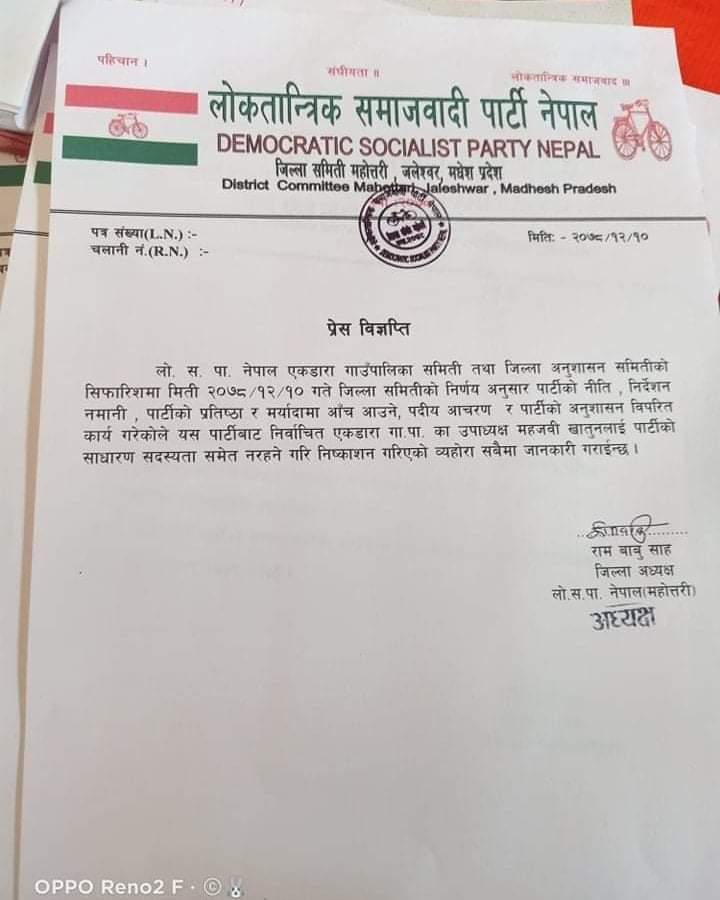 महोत्तरी जिल्ला कार्यसमितिले बिहीबार विज्ञप्ति जारी गर्दै उपाध्यक्ष खातुनलाई साधारण सदस्य समेत नरहने गरी कारबाही गरेको जनाएको छ ।